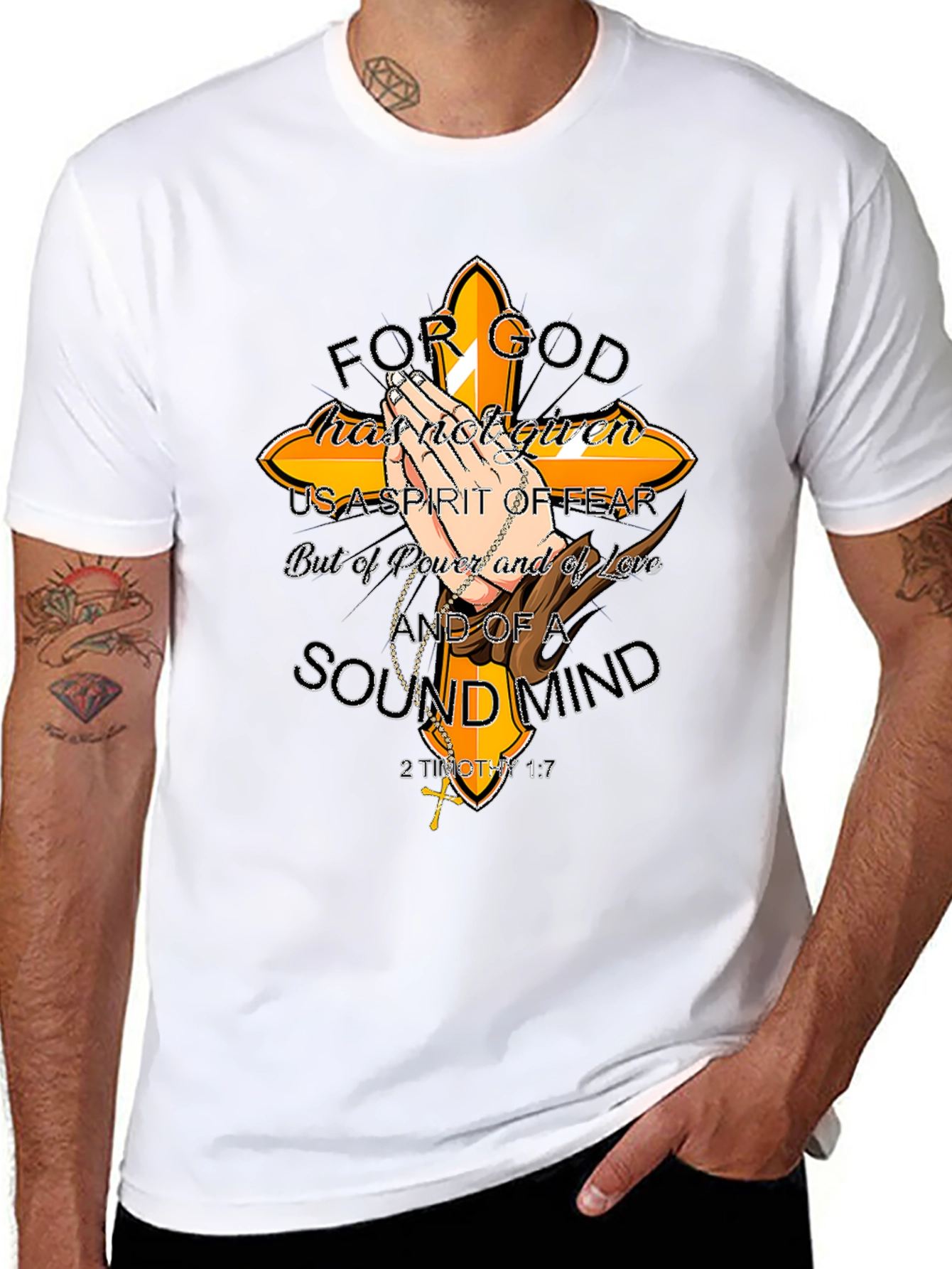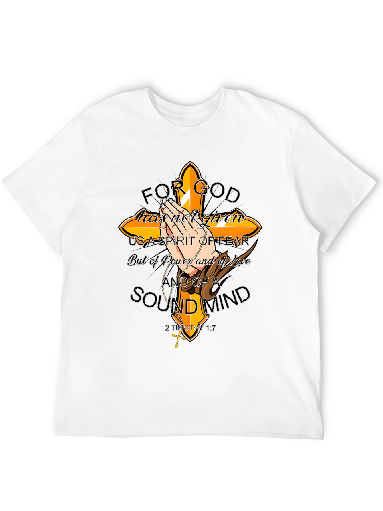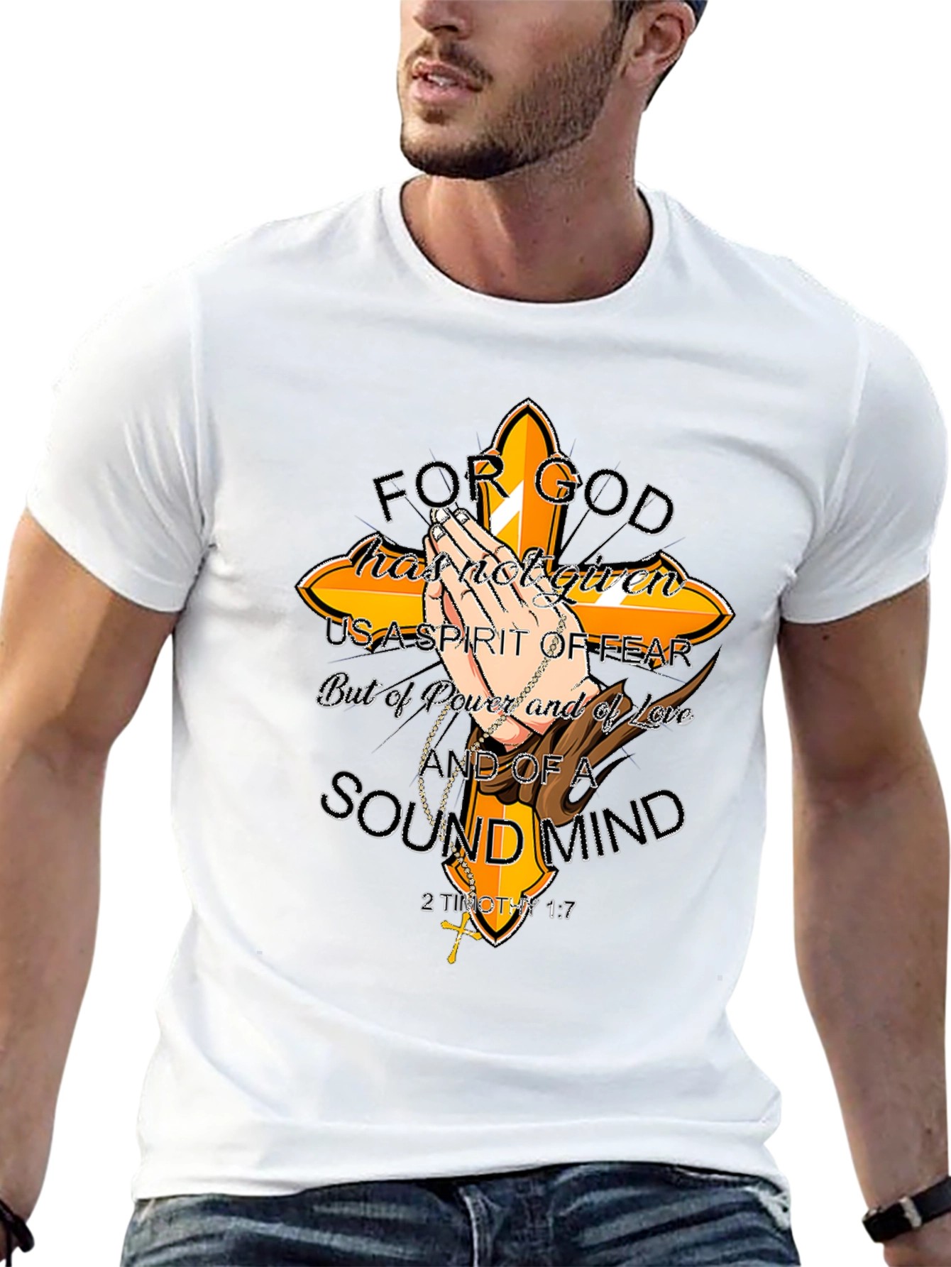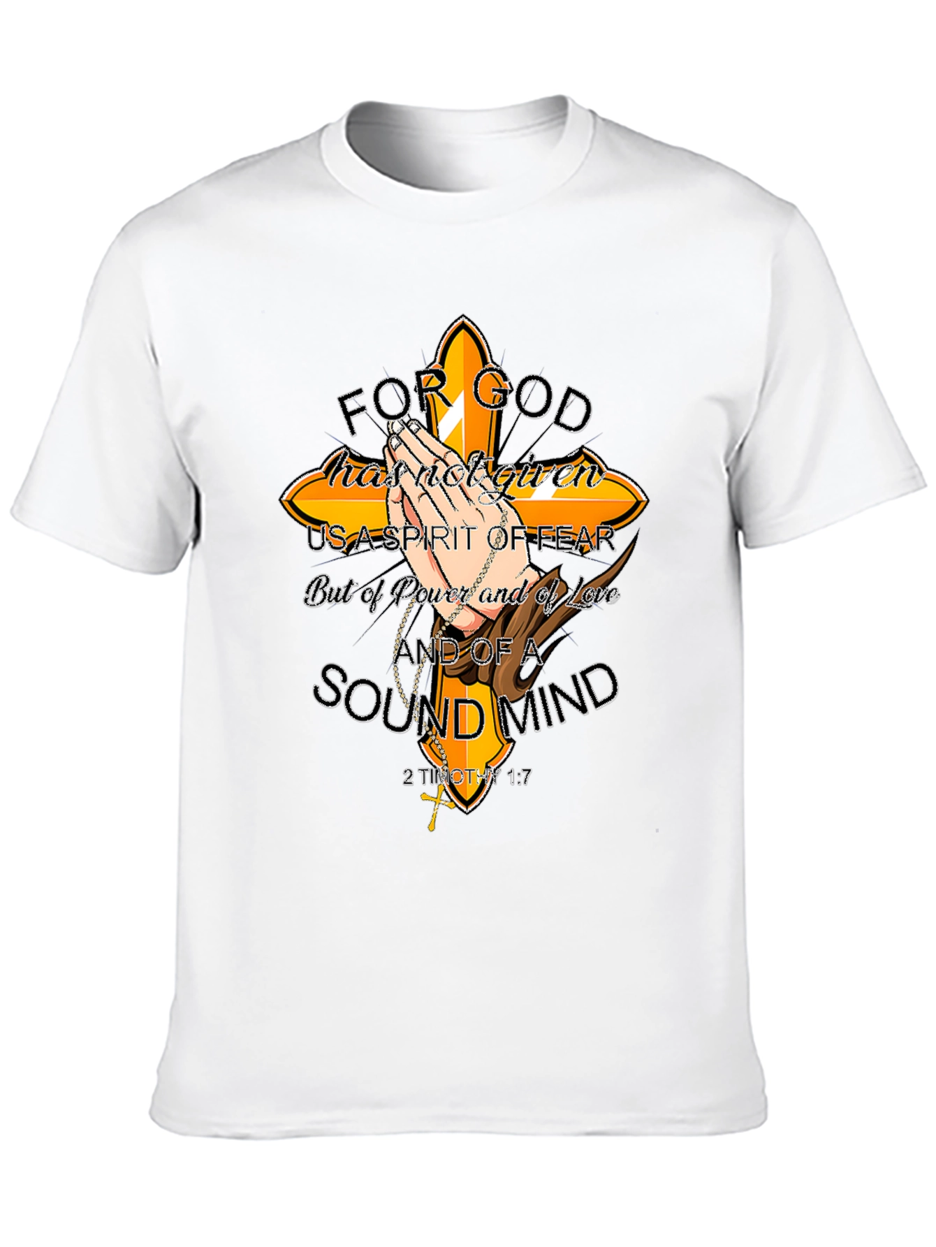 Luce tu fe con esta elegante camiseta negra. Presenta un diseño llamativo con una cruz dorada y manos en oración, rodeada por la inspiradora frase "FOR GOD has not given US A SPIRIT OF FEAR But of Power and of Love AND OF A SOUND MIND 2 TIMOTHY 1:7". Perfecta para expresar tu espiritualidad con estilo y comodidad. Ideal para uso diario, eventos religiosos o como un regalo significativo para amigos y familiares. El tejido suave y de alta calidad garantiza una sensación agradable al tacto. ¡Muestra tu devoción con esta prenda única y poderosa!