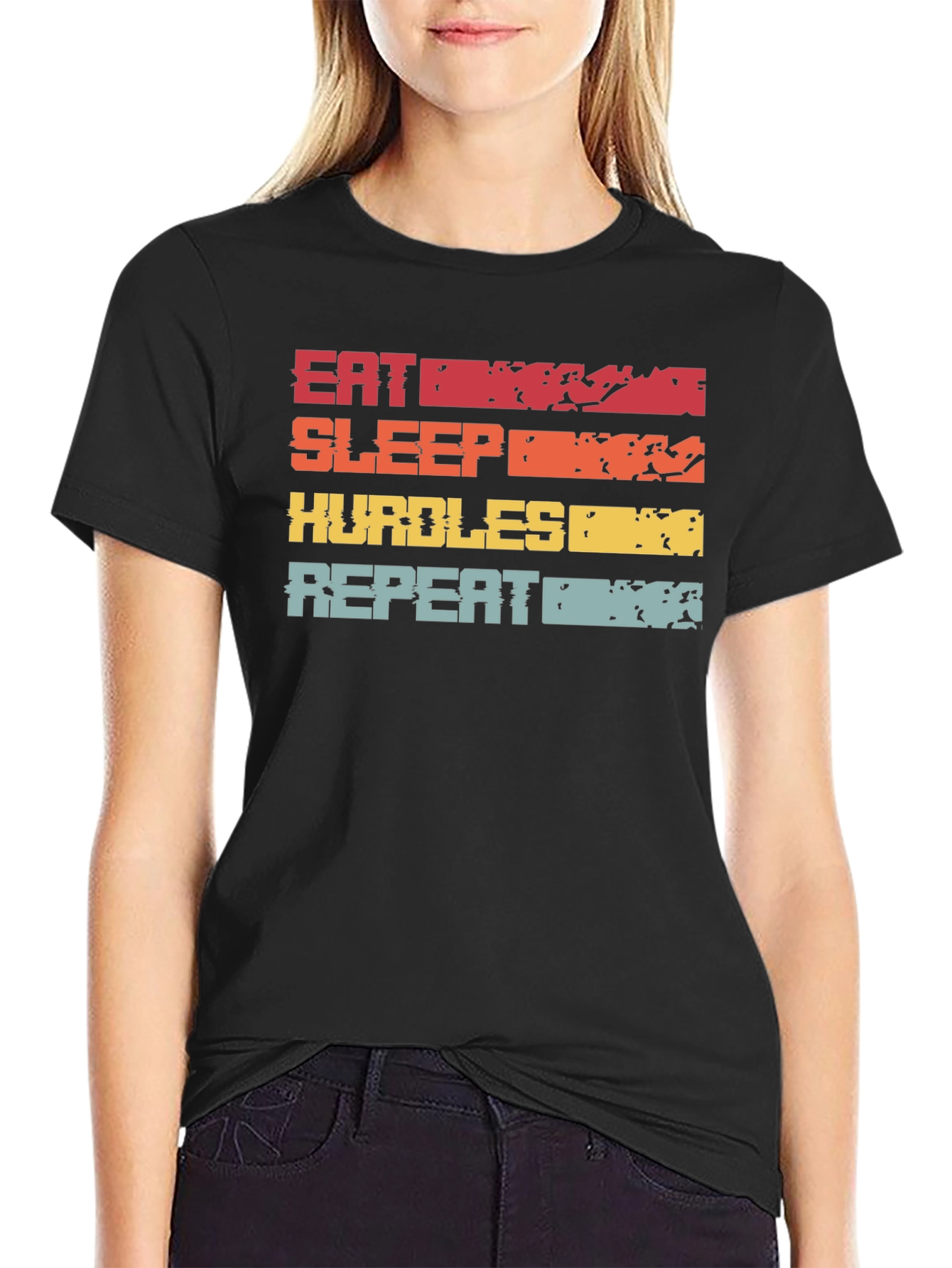 Luce un estilo deportivo y motivador con esta camiseta negra de manga corta. Presenta un diseño llamativo con las palabras "EAT SLEEP HURDLES REPEAT" impresas en bloques horizontales con efecto desgastado y colores vibrantes como rojo, naranja, amarillo y turquesa. Ideal para atletas y amantes del running o salto de vallas. Fabricada con materiales suaves y cómodos, perfecta para entrenar o para un look casual con un toque atlético. Combina esta camiseta con tus pantalones deportivos favoritos y demuestra tu pasión por el deporte.