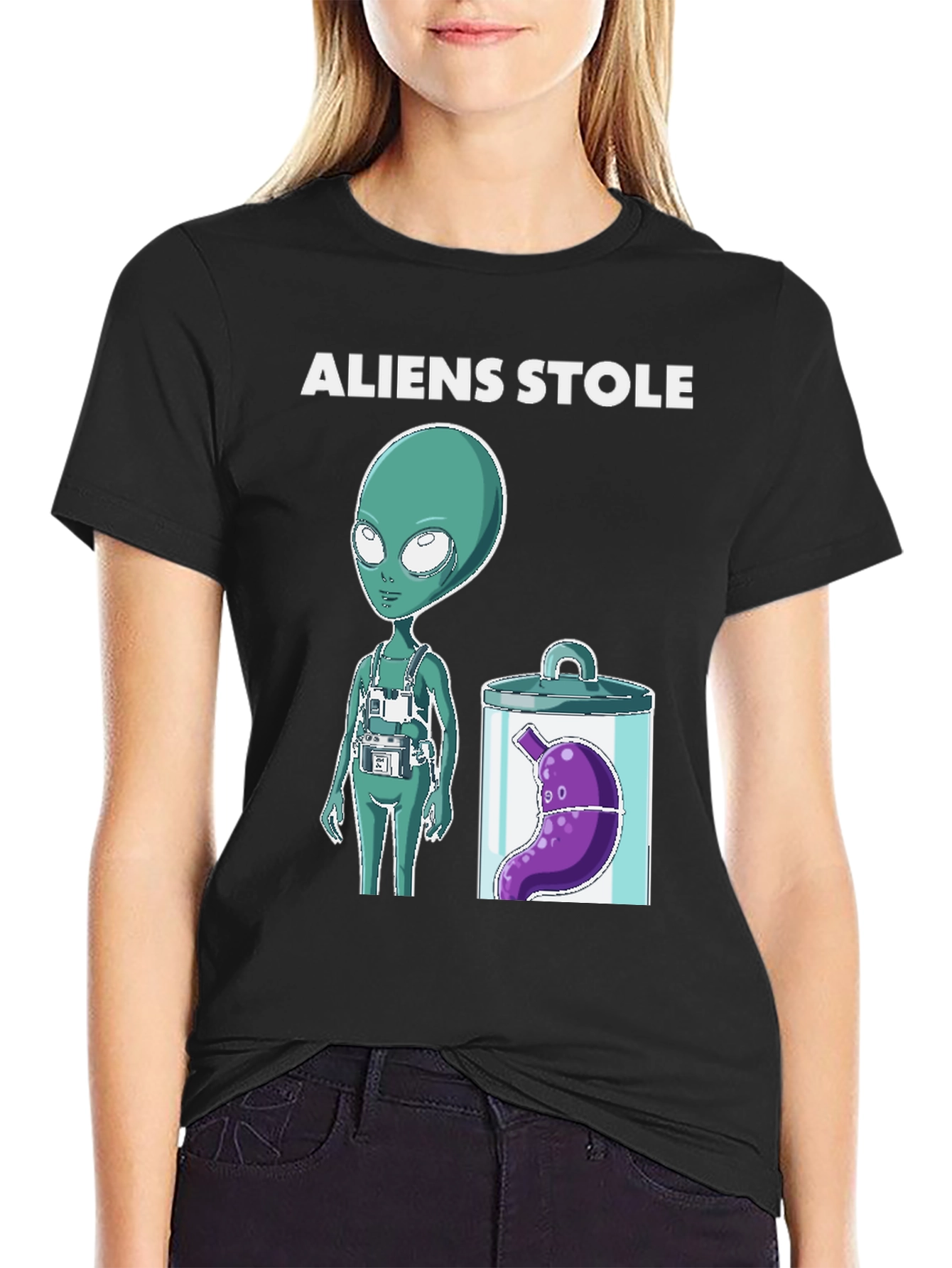 Muestra tu sentido del humor con esta camiseta negra de manga corta que presenta un divertido diseño de temática alienígena. La impresión muestra un simpático extraterrestre verde junto a un tarro con un estómago morado flotando, acompañado del texto "ALIENS STOLE". Ideal para los amantes de la ciencia ficción y las bromas originales, esta camiseta es perfecta para llevar en eventos casuales, reuniones con amigos o simplemente para añadir un toque de diversión a tu vestuario diario. Su diseño llamativo seguramente iniciará conversaciones y sacará sonrisas. Confeccionada con materiales de alta calidad para un tacto suave y cómodo.