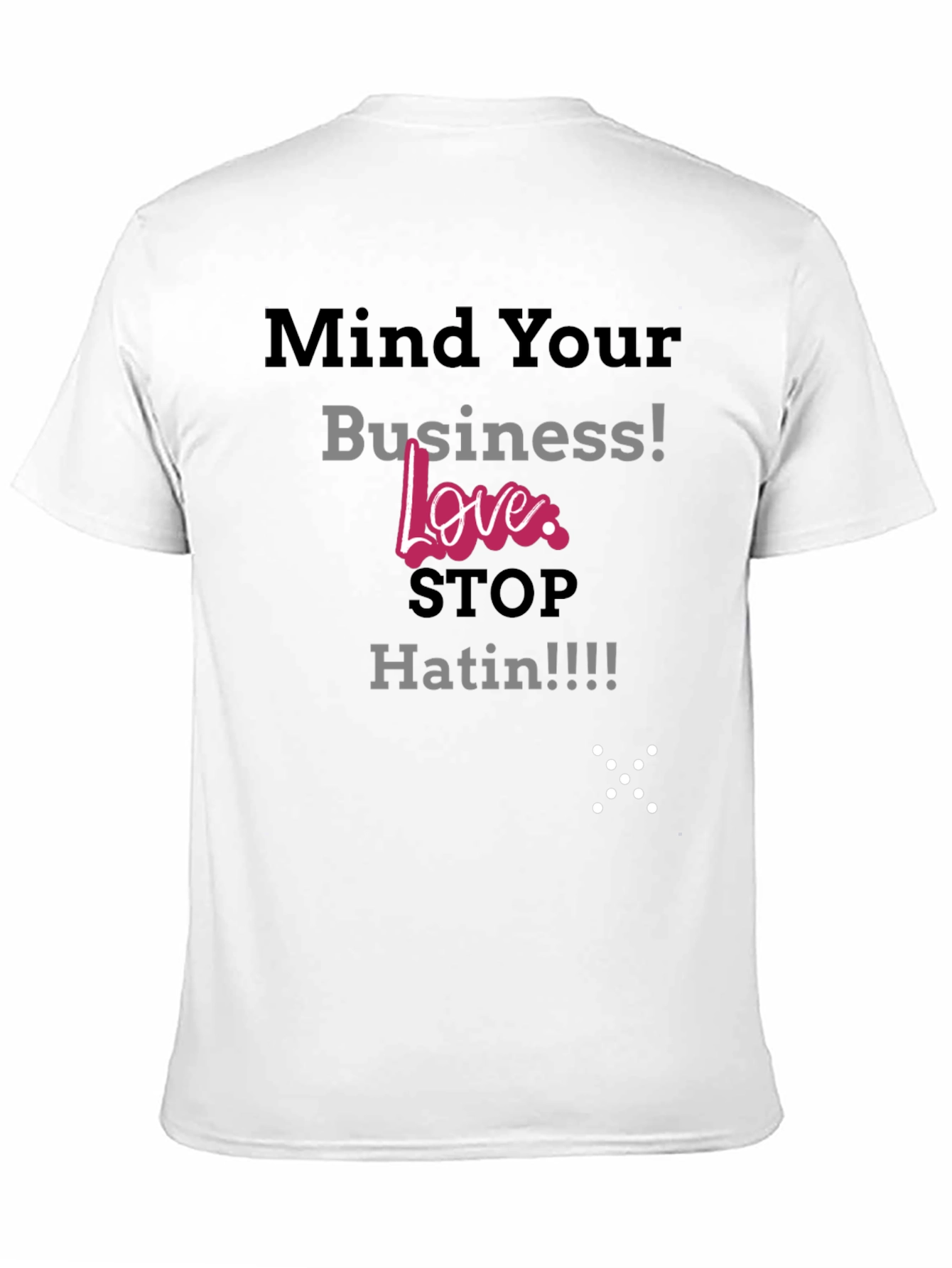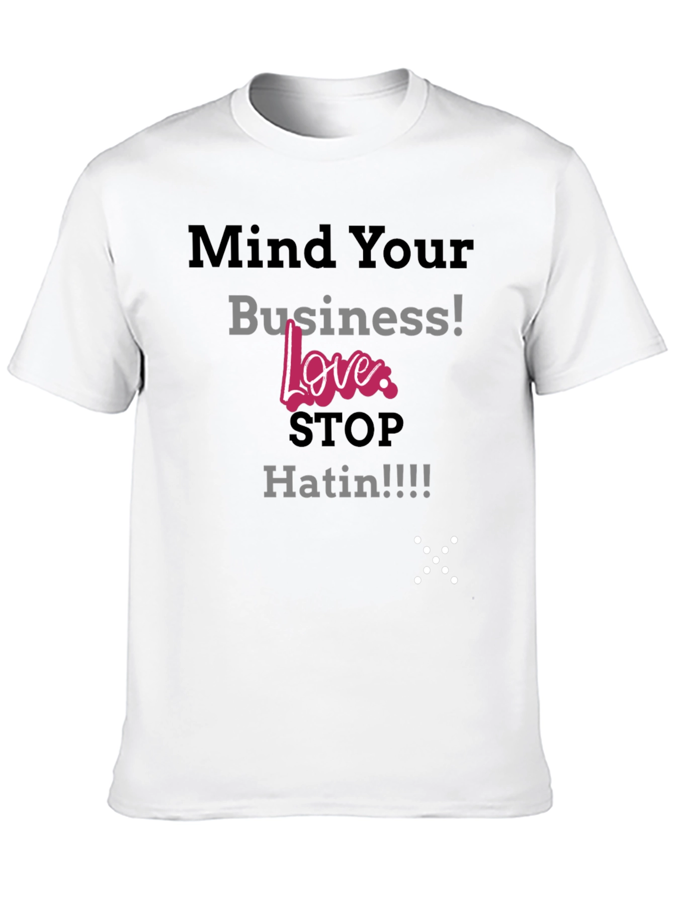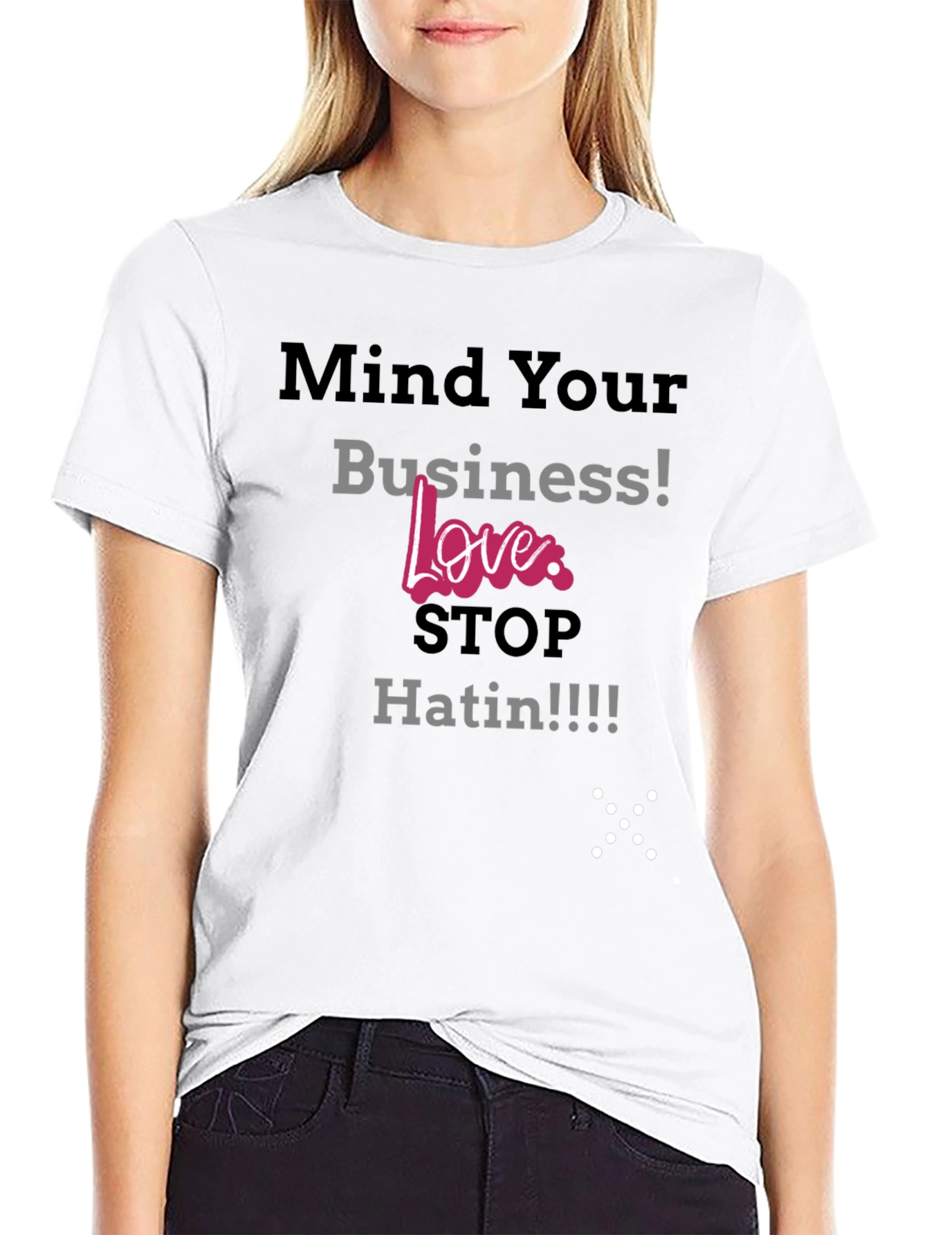 Luce esta moderna camiseta negra con un mensaje inspirador. Presenta un diseño llamativo con la frase "Mind Your Business!" en gris, seguida de "Love" en un vibrante rosa. Debajo, la exhortación "STOP Hatin!!!!" también en gris, junto con un sutil detalle gráfico de puntos. Perfecta para expresar tu actitud positiva y tu estilo único. Ideal para uso casual, salidas con amigos o como una declaración de moda en cualquier ocasión. ¡Haz una declaración audaz con esta camiseta que promueve el amor y la positividad!