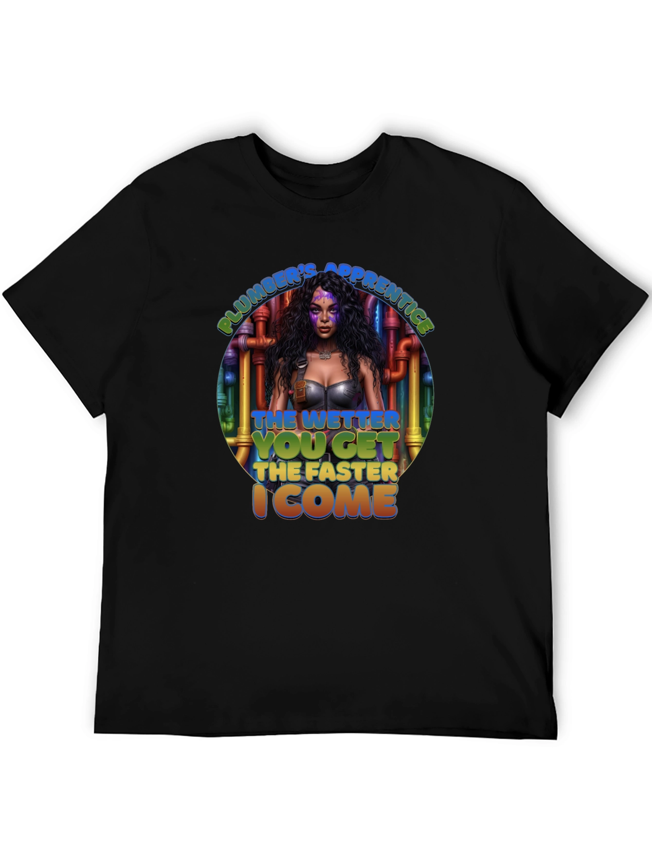 Esta camiseta negra presenta un diseño audaz y provocativo. Muestra una imagen de una mujer con maquillaje facial y un atuendo llamativo, situada dentro de un círculo con tuberías coloridas de fondo. El texto "Plumber's Apprentice" rodea la parte superior, mientras que "The Wetter You Get, The Faster I Come" se destaca en el centro con un degradado de colores. Ideal para quienes buscan una prenda llamativa y con un toque de humor adulto, esta camiseta es perfecta para destacar en cualquier ocasión informal. Su diseño único asegura que te robarás las miradas y generarás conversación.
