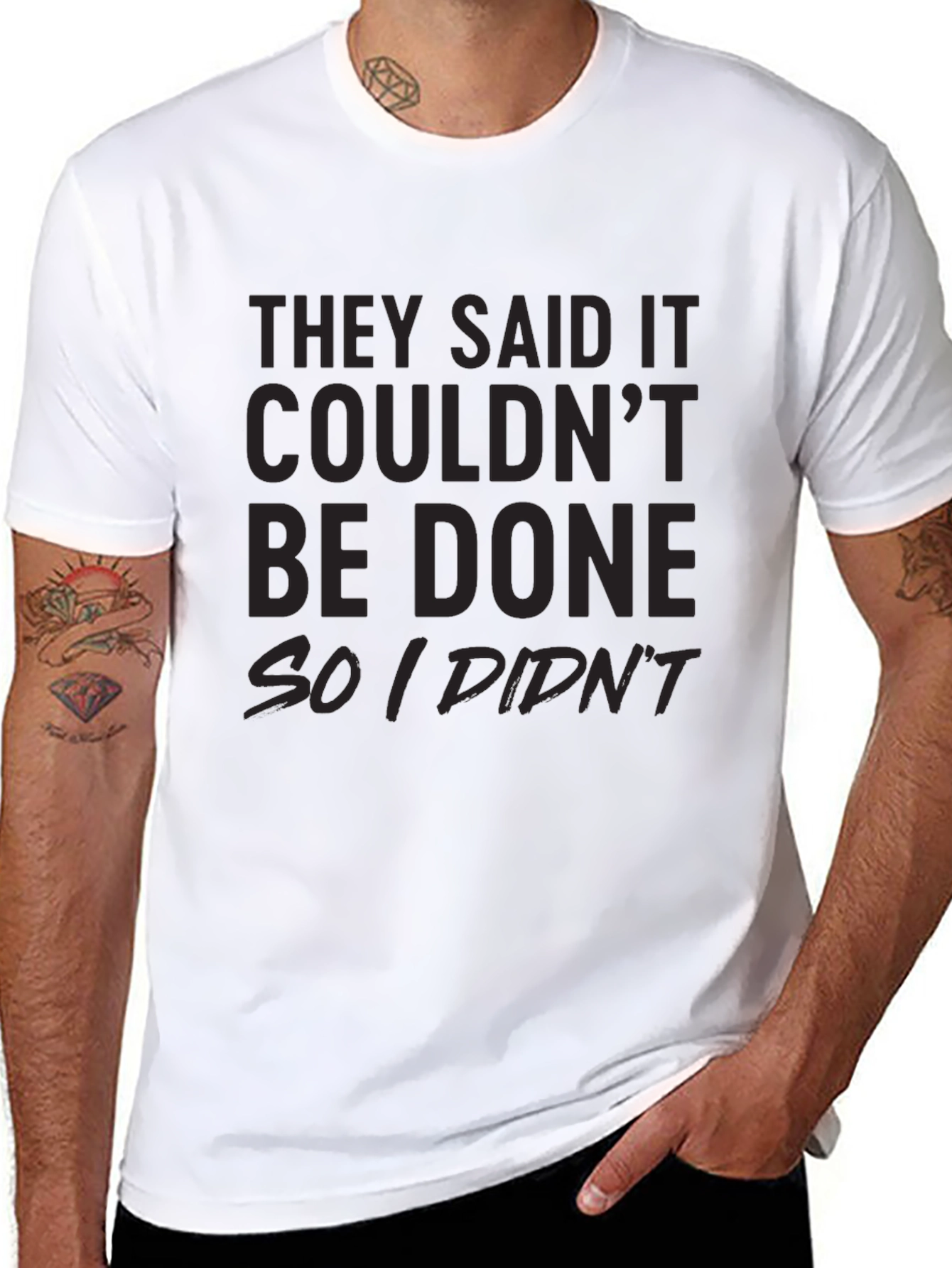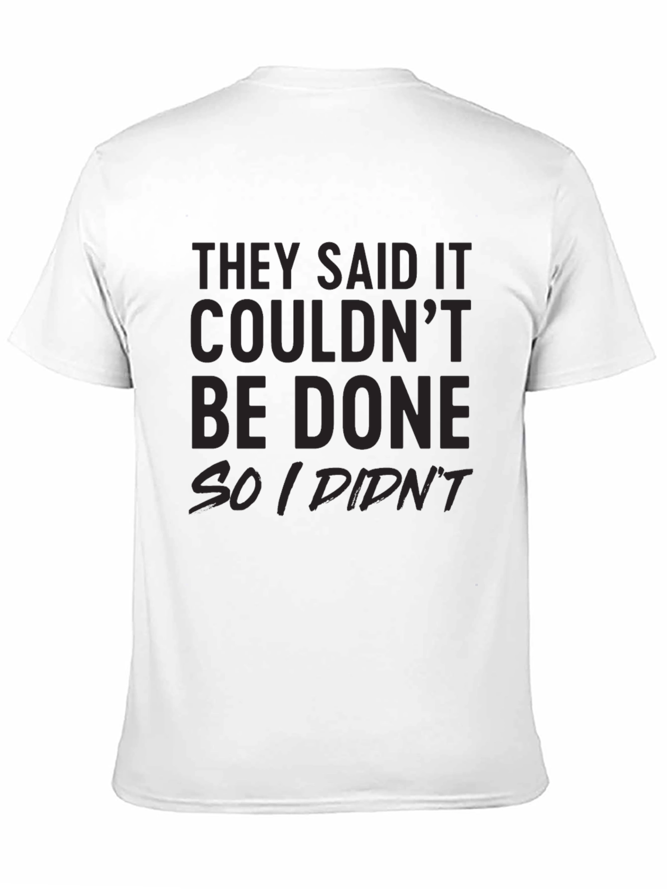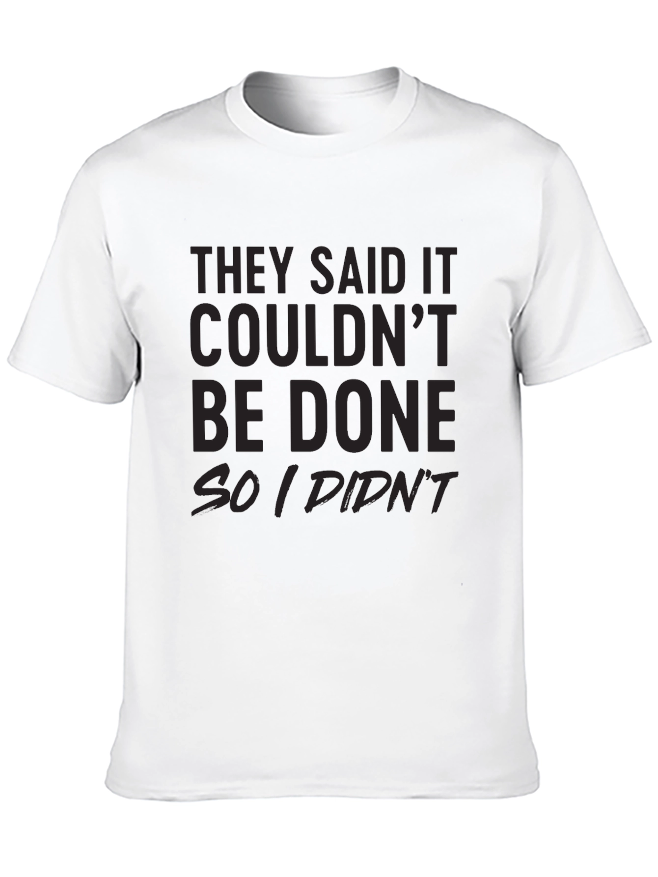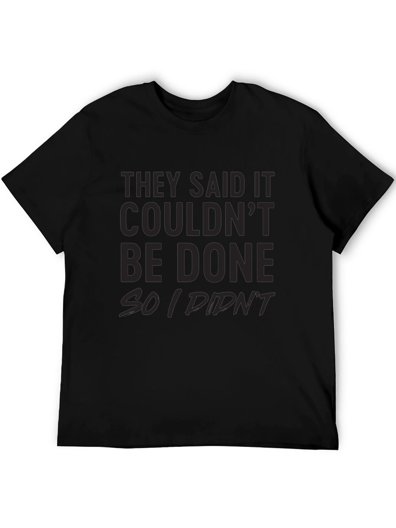 Esta camiseta negra presenta un diseño llamativo con la frase "They said it couldn't be done so I didn't", demostrando una actitud relajada y divertida. Su material parece ser de algodón suave, proporcionando comodidad durante todo el día. Ideal para usar en salidas casuales, reuniones con amigos o simplemente para expresar tu personalidad con un toque de humor. Combina fácilmente con jeans, pantalones cortos o faldas. Una prenda versátil y con estilo que seguramente llamará la atención y provocará sonrisas.