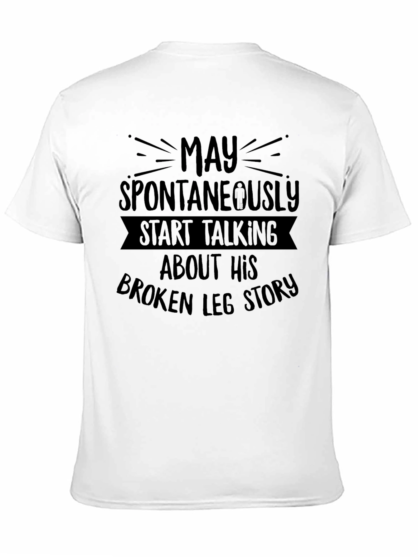 ¡Prepárate para las risas! Esta camiseta negra de manga corta presenta un diseño llamativo con la frase "Puede espontáneamente empezar a hablar sobre su historia de pierna rota". Perfecta para el hombre con un sentido del humor único y una historia que contar, esta camiseta seguramente será un iniciador de conversaciones. Ideal para uso casual, reuniones con amigos o simplemente para expresar tu personalidad. El tejido suave y cómodo garantiza un ajuste perfecto y una sensación agradable al tacto. ¡Añade un toque de humor a tu vestuario con esta camiseta original y divertida!