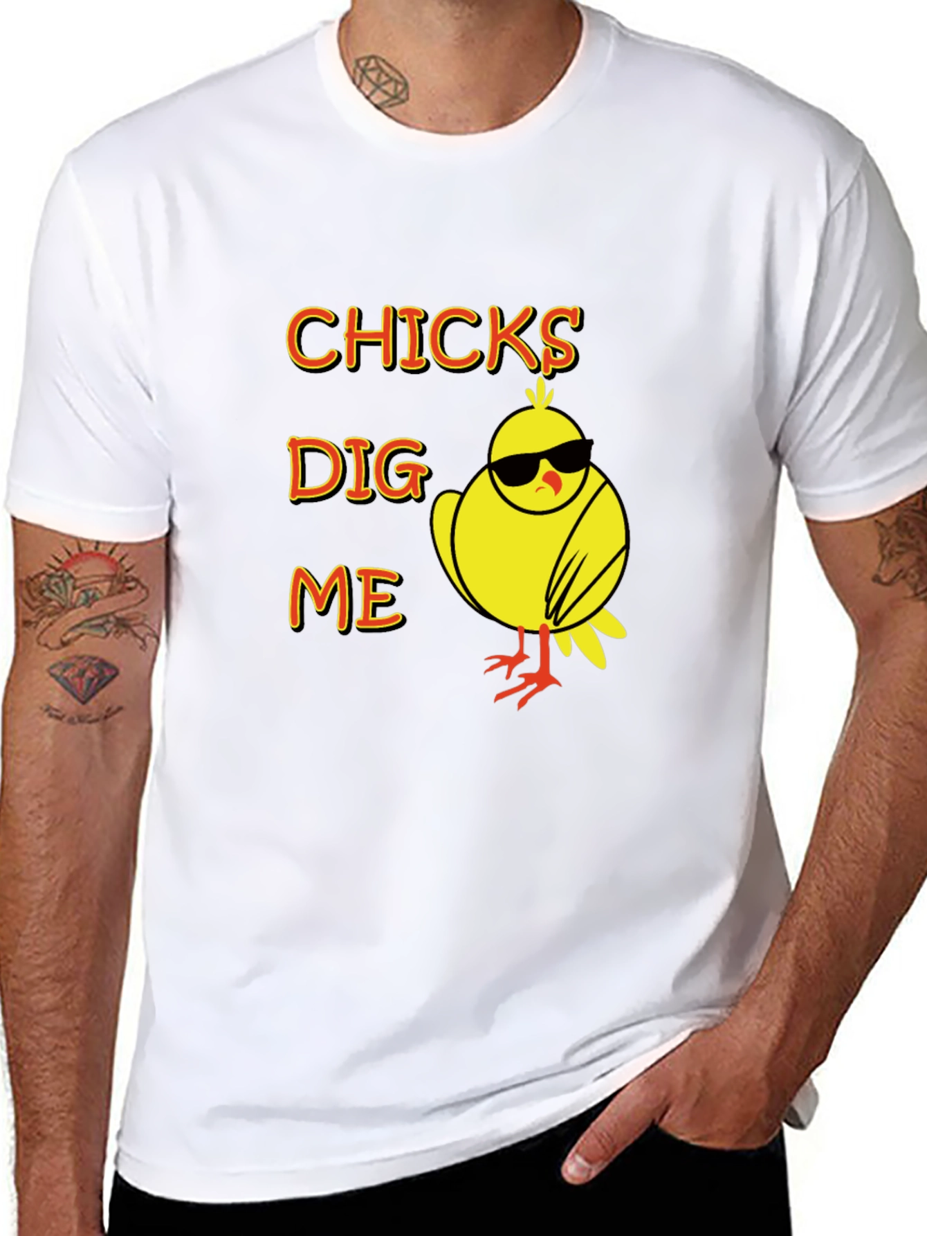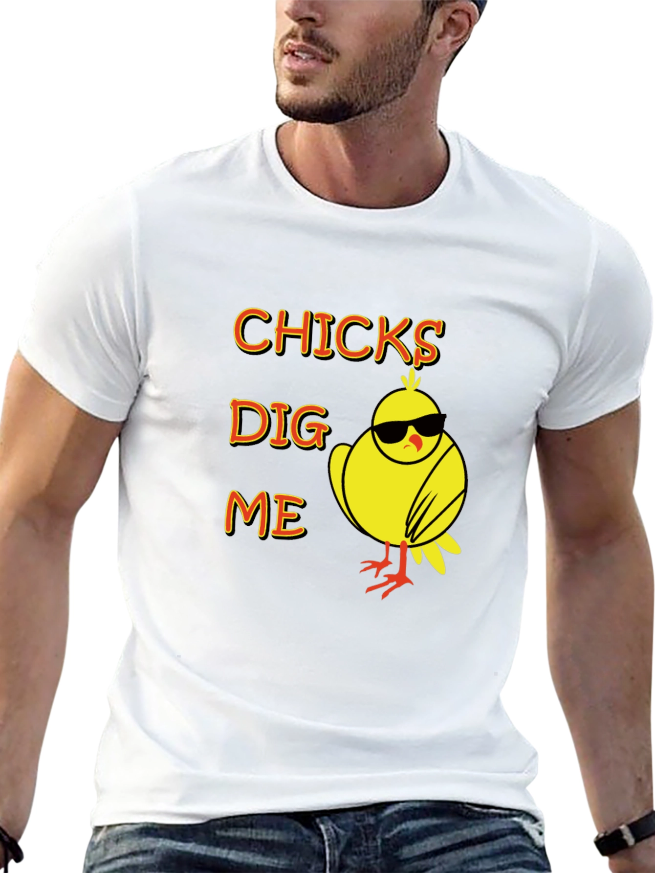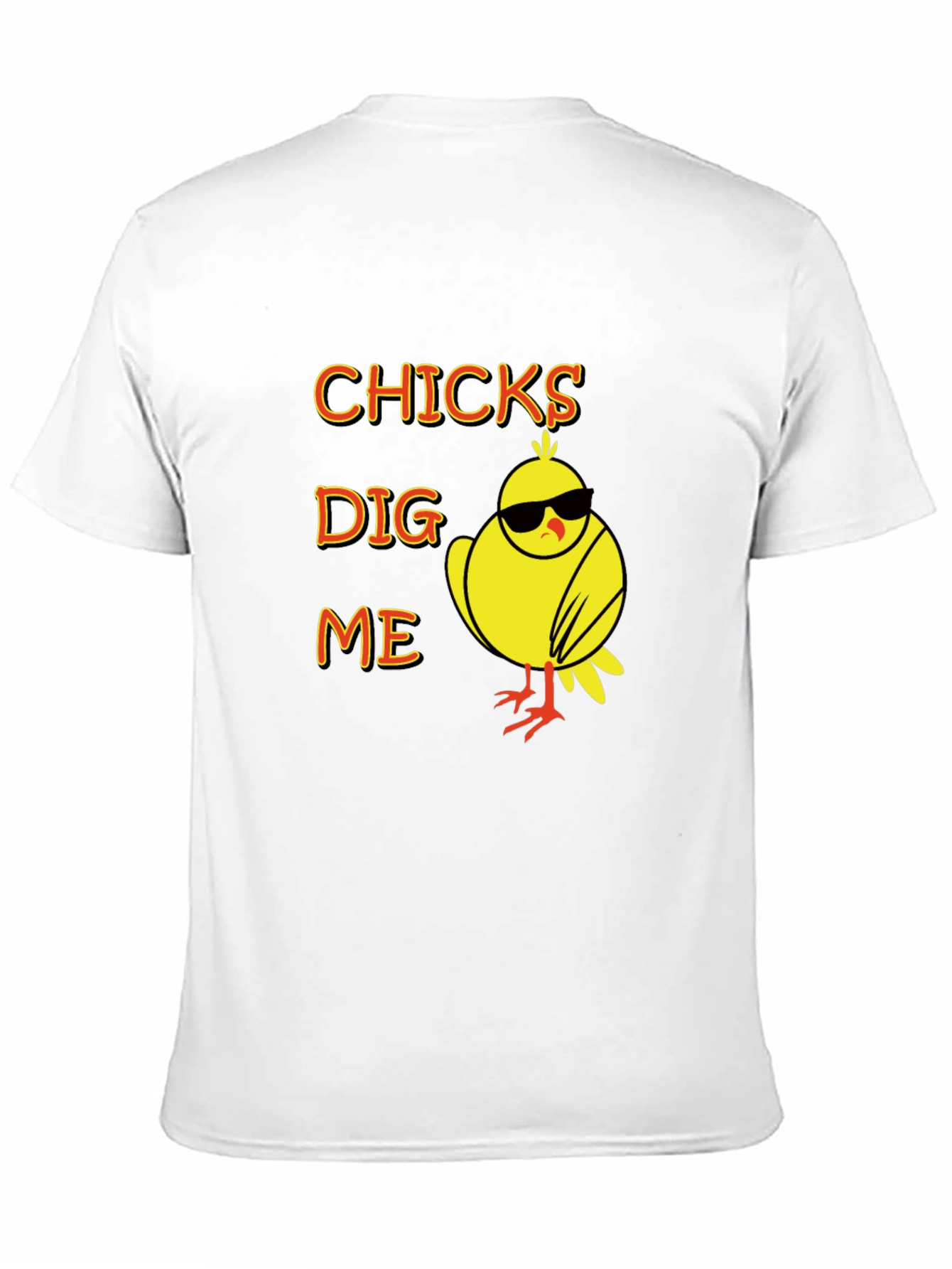 Esta llamativa camiseta negra presenta un diseño divertido y audaz. En la parte delantera, se puede ver la frase "CHICKS DIG ME" (Pollitos me aman) en letras de color naranja con borde rojo, acompañada de la ilustración de un pollito amarillo con gafas de sol. El diseño es ideal para aquellos que buscan añadir un toque de humor y originalidad a su vestuario. Fabricada en un material suave y cómodo, esta camiseta es perfecta para usar en ocasiones casuales, salidas con amigos o simplemente para expresar tu personalidad con estilo. ¡Llama la atención y diviértete con esta prenda única!