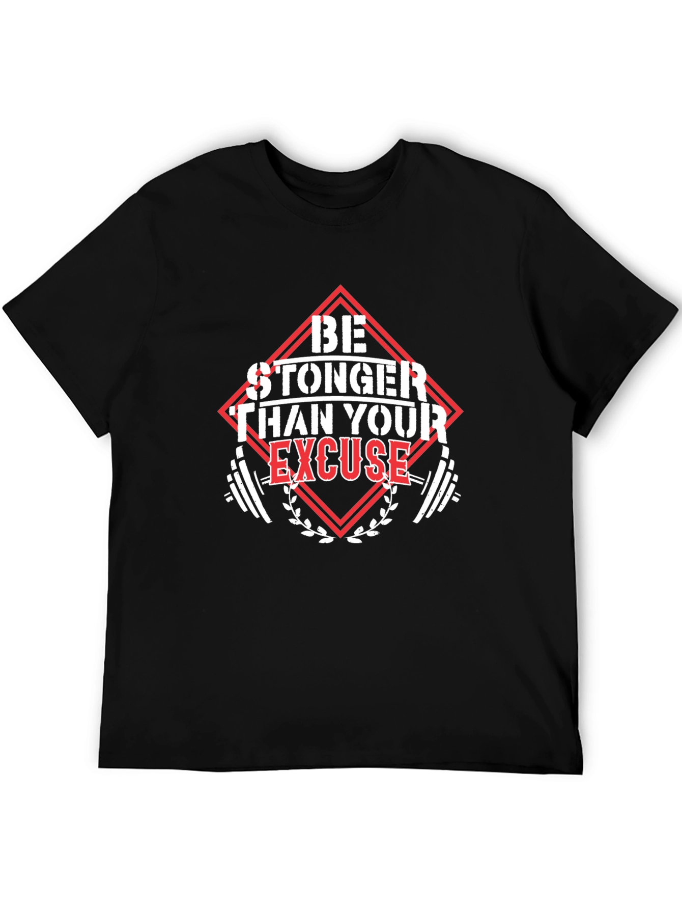 Esta camiseta negra de manga corta presenta un diseño motivacional audaz, perfecto para tus entrenamientos o para un estilo casual. En el centro, un gráfico llamativo en rojo y blanco proclama "BE STRONGER THAN YOUR EXCUSE" (Sé más fuerte que tu excusa), enmarcado en una forma de diamante con pesas estilizadas a los lados. La camiseta parece ser de algodón suave, ofreciendo comodidad y transpirabilidad. Ideal para el gimnasio, actividades deportivas o para inspirarte diariamente. ¡Luce esta camiseta y demuestra tu compromiso con la superación personal!