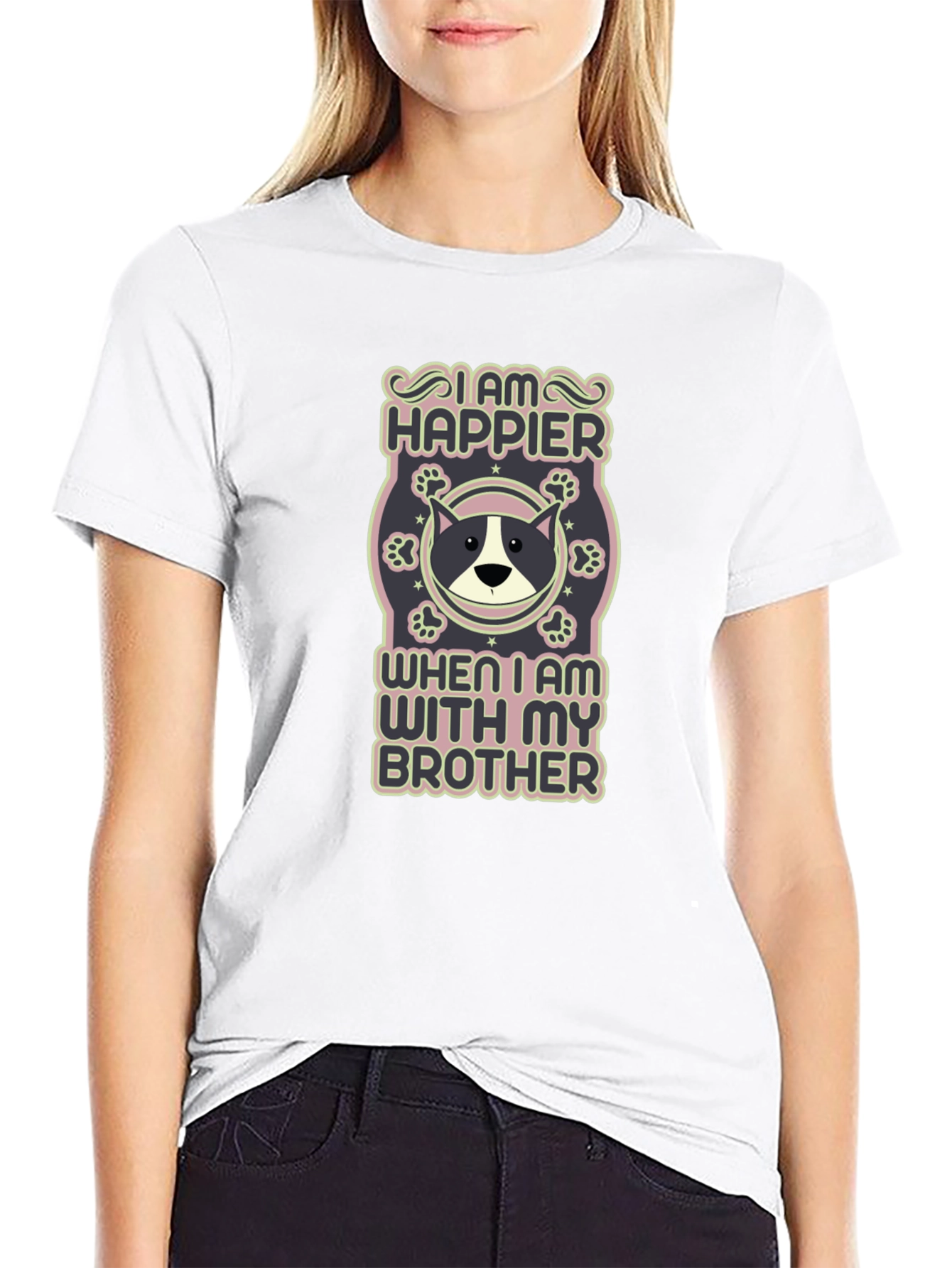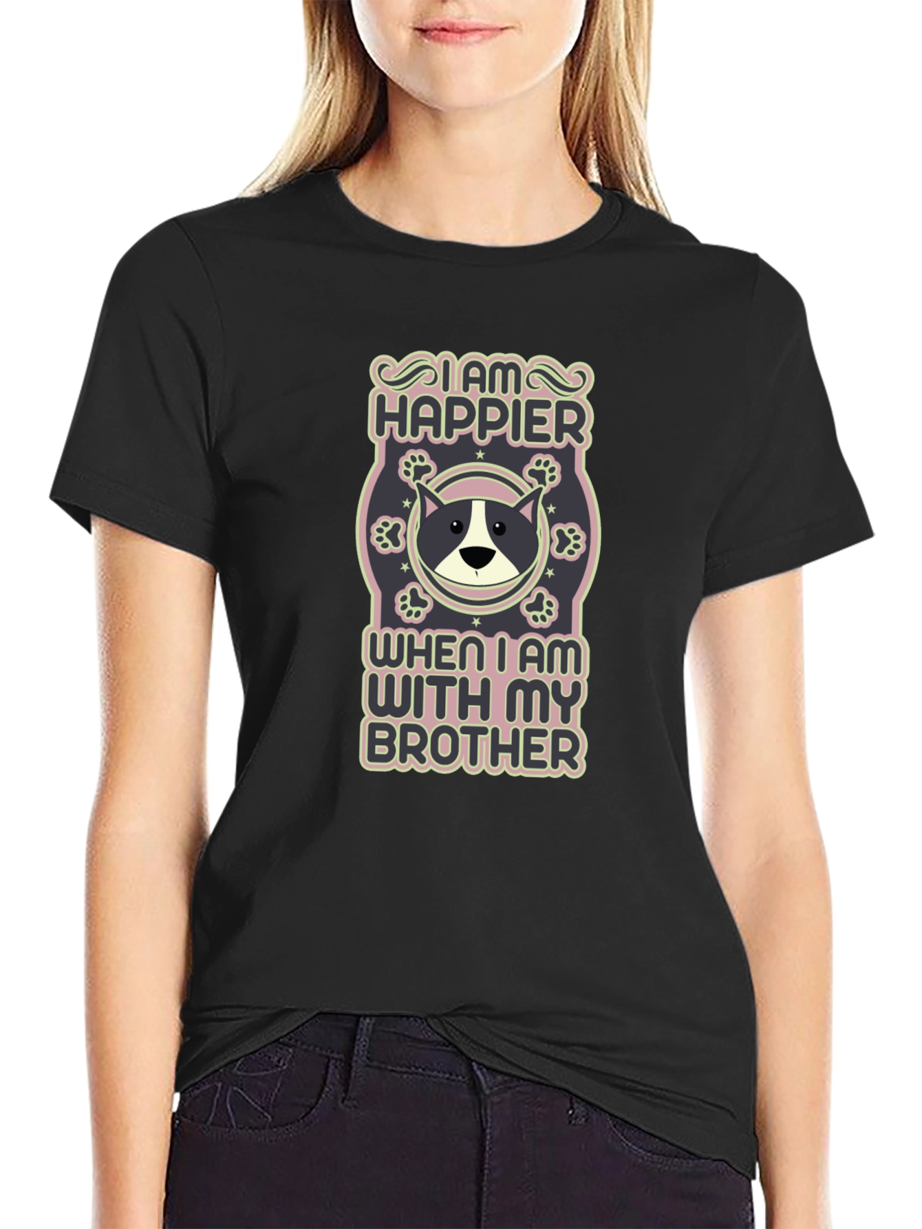 Luce esta moderna camiseta negra con un adorable diseño canino. La camiseta presenta un gráfico estilizado con la frase "Soy más feliz con mi hermano" rodeando la imagen de un perro. El diseño incorpora colores suaves y un estilo caricaturesco que le da un toque juvenil y divertido. Ideal para los amantes de los perros, esta camiseta es perfecta para usar en el día a día, paseos al aire libre o simplemente para expresar tu cariño por tu mascota. Confeccionada con materiales de alta calidad para asegurar comodidad y durabilidad. Muestra tu amor por tu mejor amigo de cuatro patas con esta original camiseta.