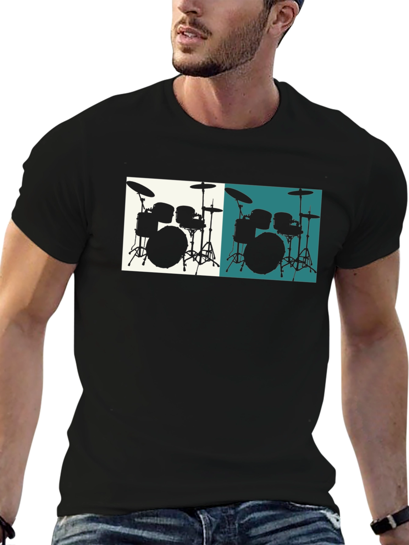 Luce tu pasión por la música con esta moderna camiseta negra. Presenta un llamativo diseño de una batería en silueta, duplicado con fondos en tonos contrastantes para un efecto visual dinámico y atractivo. Su corte clásico y tejido suave aseguran comodidad durante todo el día. Ideal para músicos, amantes de la música y cualquiera que quiera expresar su estilo único. Perfecta para conciertos, ensayos o simplemente para un look casual con un toque musical. ¡Atrévete a destacar con esta prenda original y llena de ritmo!