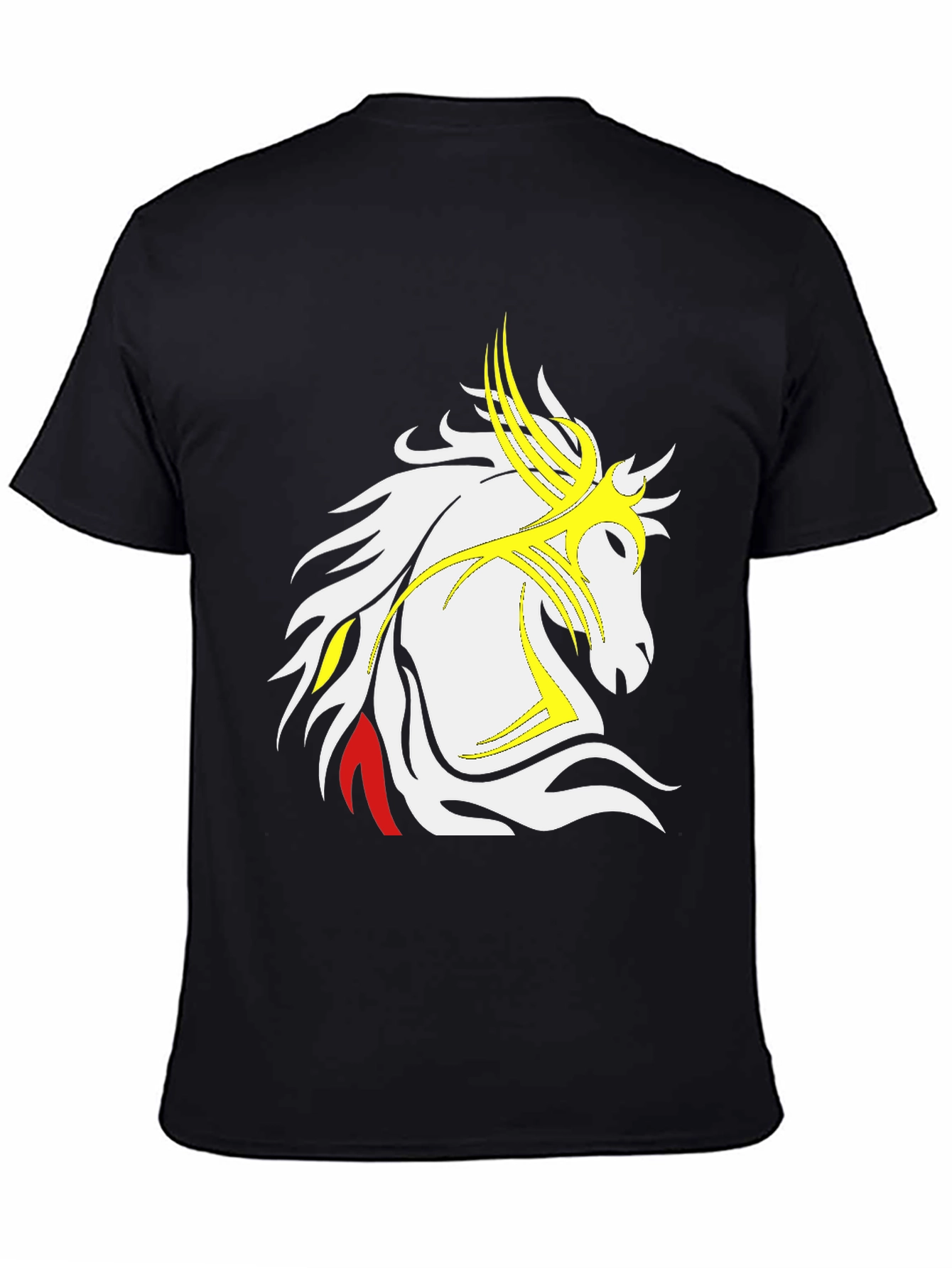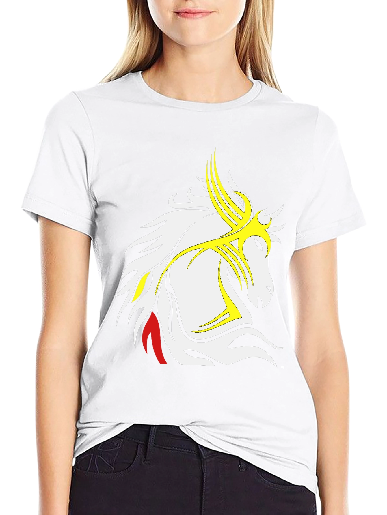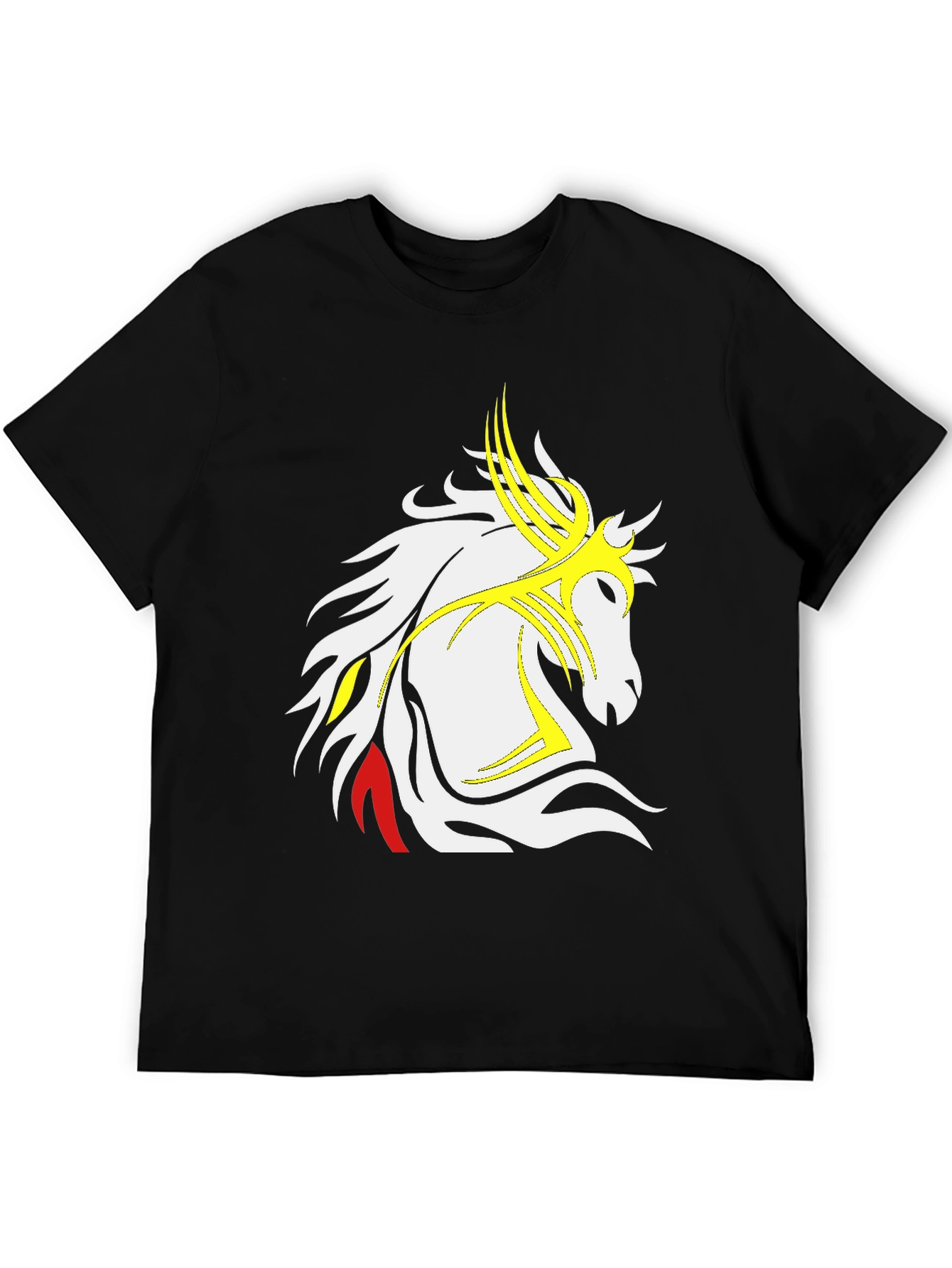 Luce con estilo esta llamativa camiseta negra de manga corta. Presenta un audaz diseño gráfico de un caballo estilizado en blanco con detalles en amarillo y rojo, evocando un aire tribal y moderno. Ideal para un look casual y cómodo, perfecta para el día a día o para destacar en un evento informal. Su diseño único la convierte en una pieza imprescindible para los amantes de la moda y los diseños originales. Combínala con jeans, pantalones cortos o faldas para crear tu propio estilo. Una prenda que no pasará desapercibida.