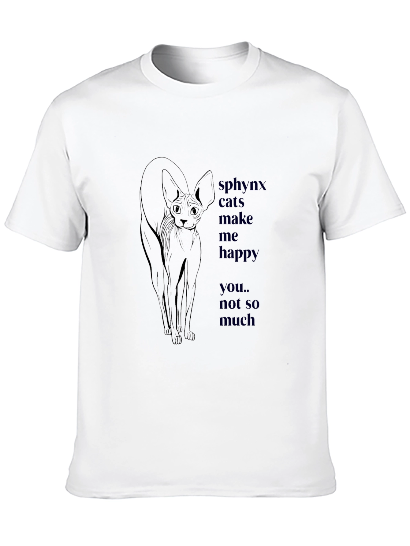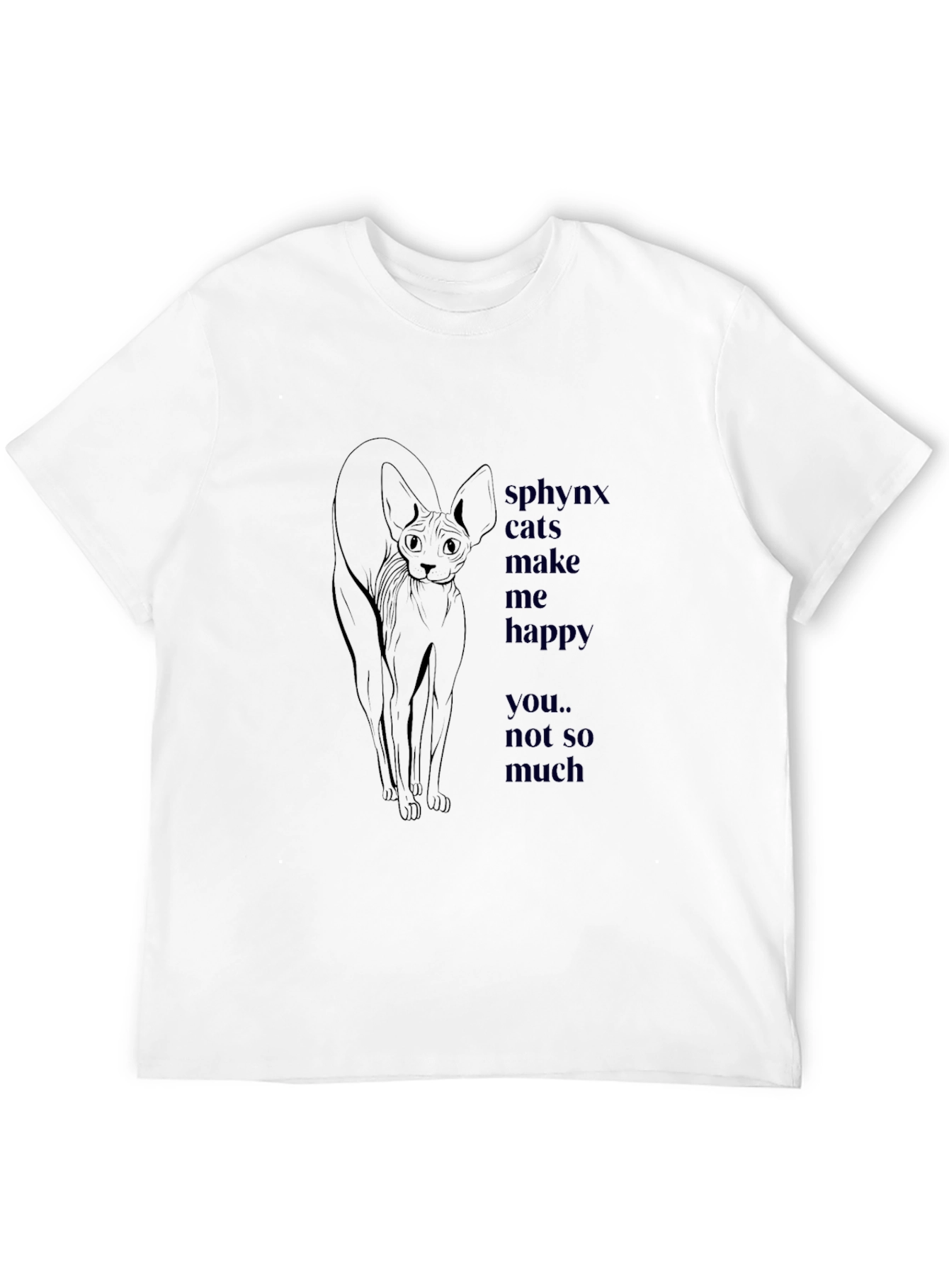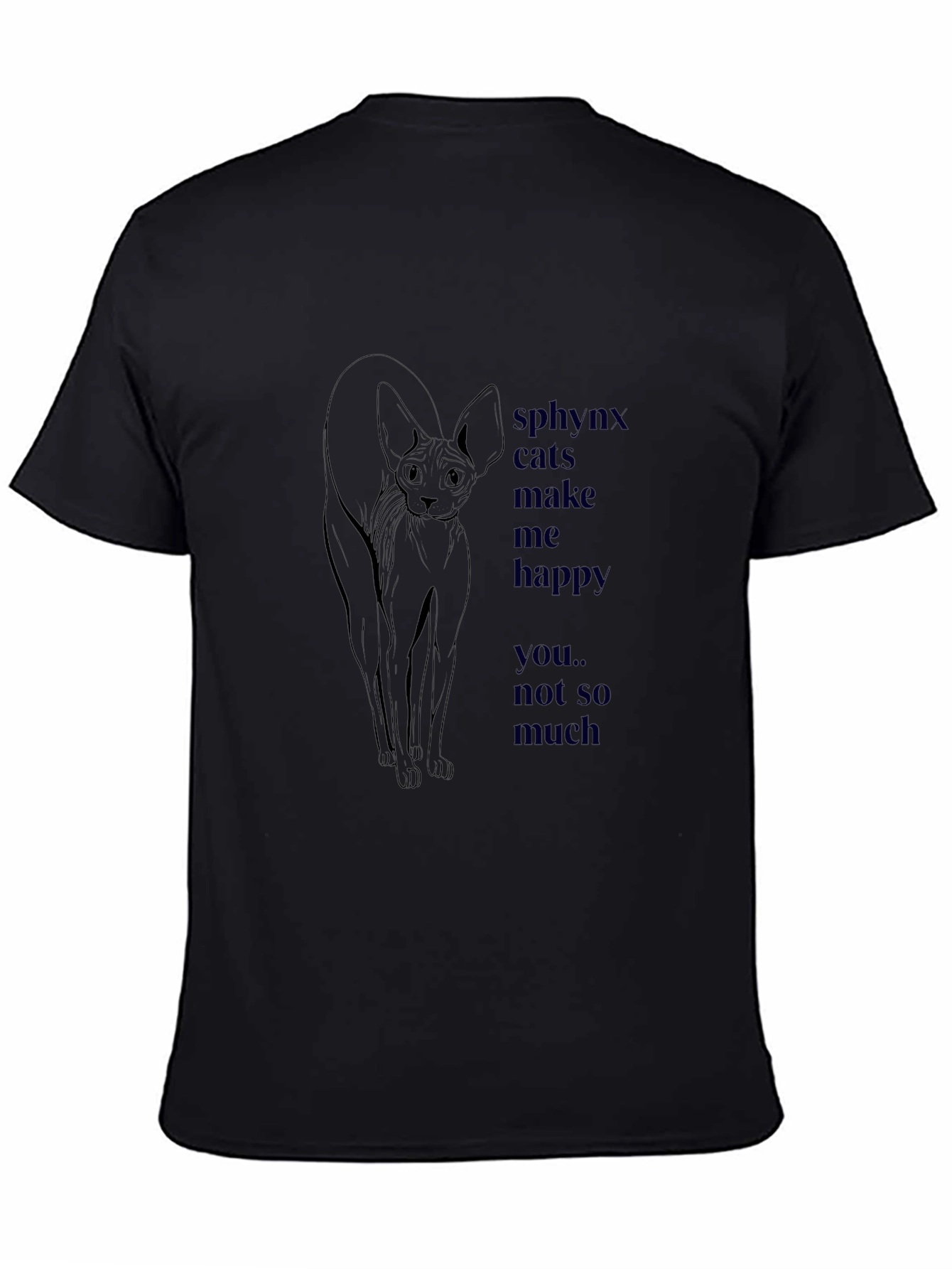 Luce esta original camiseta negra de algodón con un llamativo diseño. Presenta un elegante dibujo de un gato esfinge estilizado en color oscuro, acompañado de la frase "sphynx cats make me happy... you.. not so much" también en tono oscuro. Ideal para los amantes de los gatos y las personas con sentido del humor. Perfecta para uso casual, esta camiseta te hará destacar con estilo y originalidad. Su tejido suave y cómodo te permitirá disfrutarla durante todo el día. ¡Añade un toque único a tu guardarropa con esta prenda imprescindible!