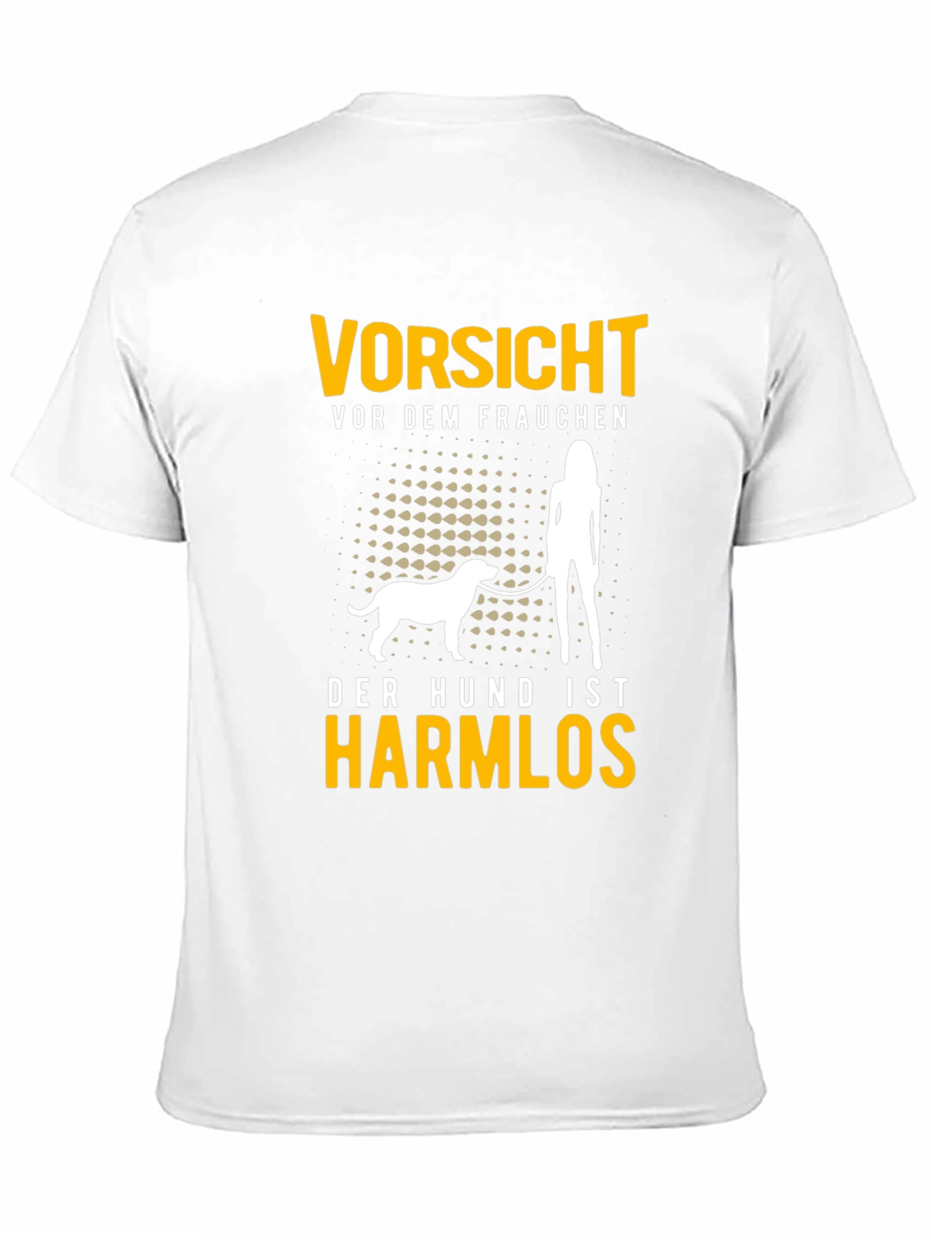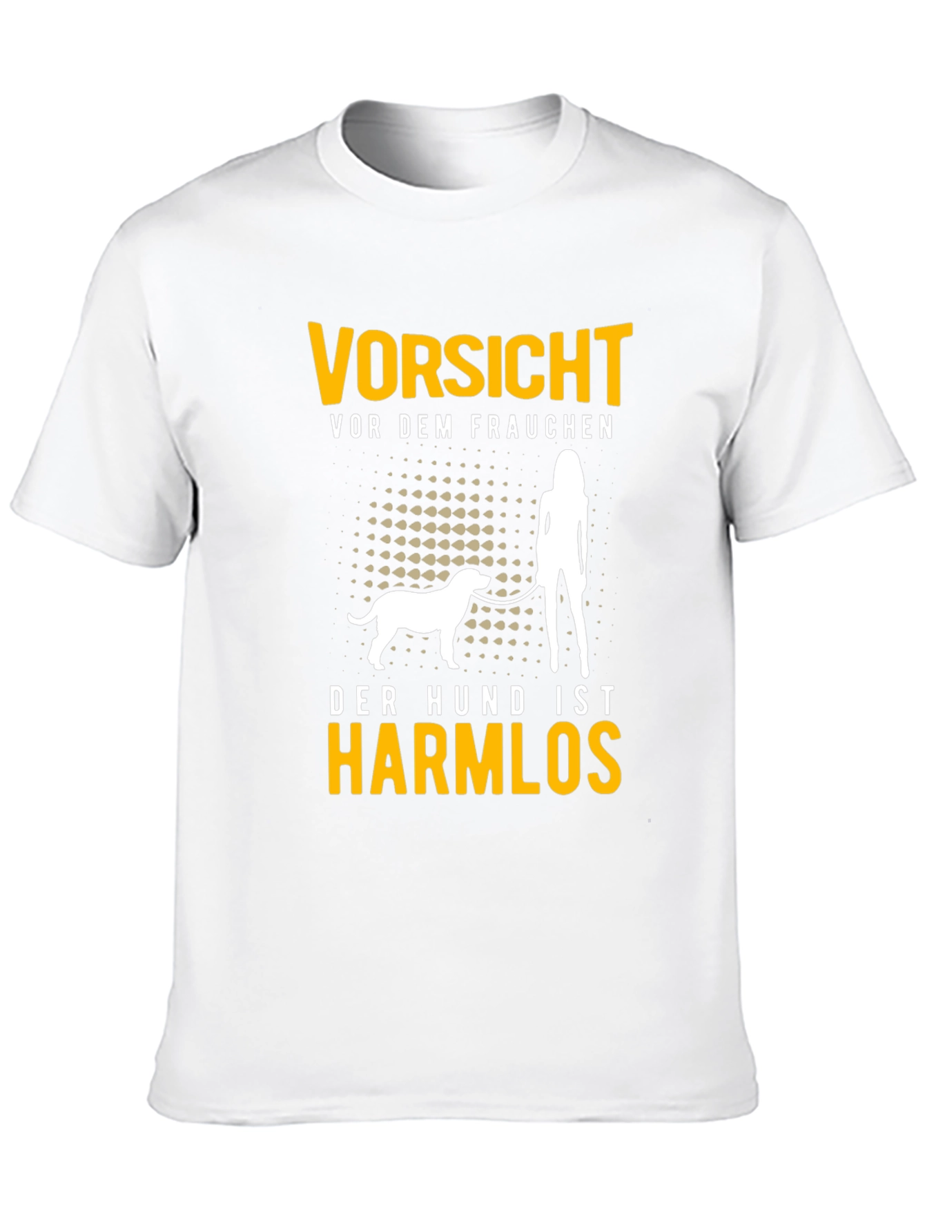 Luce esta original camiseta negra con un diseño llamativo y divertido. Muestra una silueta de una mujer paseando a un perro, con la frase "Vorsicht vor dem Frauchen, der Hund ist harmlos" (Cuidado con la dueña, el perro es inofensivo) en letras amarillas. Perfecta para los amantes de los perros con sentido del humor. Ideal para usar en salidas casuales, paseos o simplemente para expresar tu personalidad de forma única. Fabricada con materiales suaves y cómodos para el uso diario. ¡Consigue la tuya y destaca con estilo!