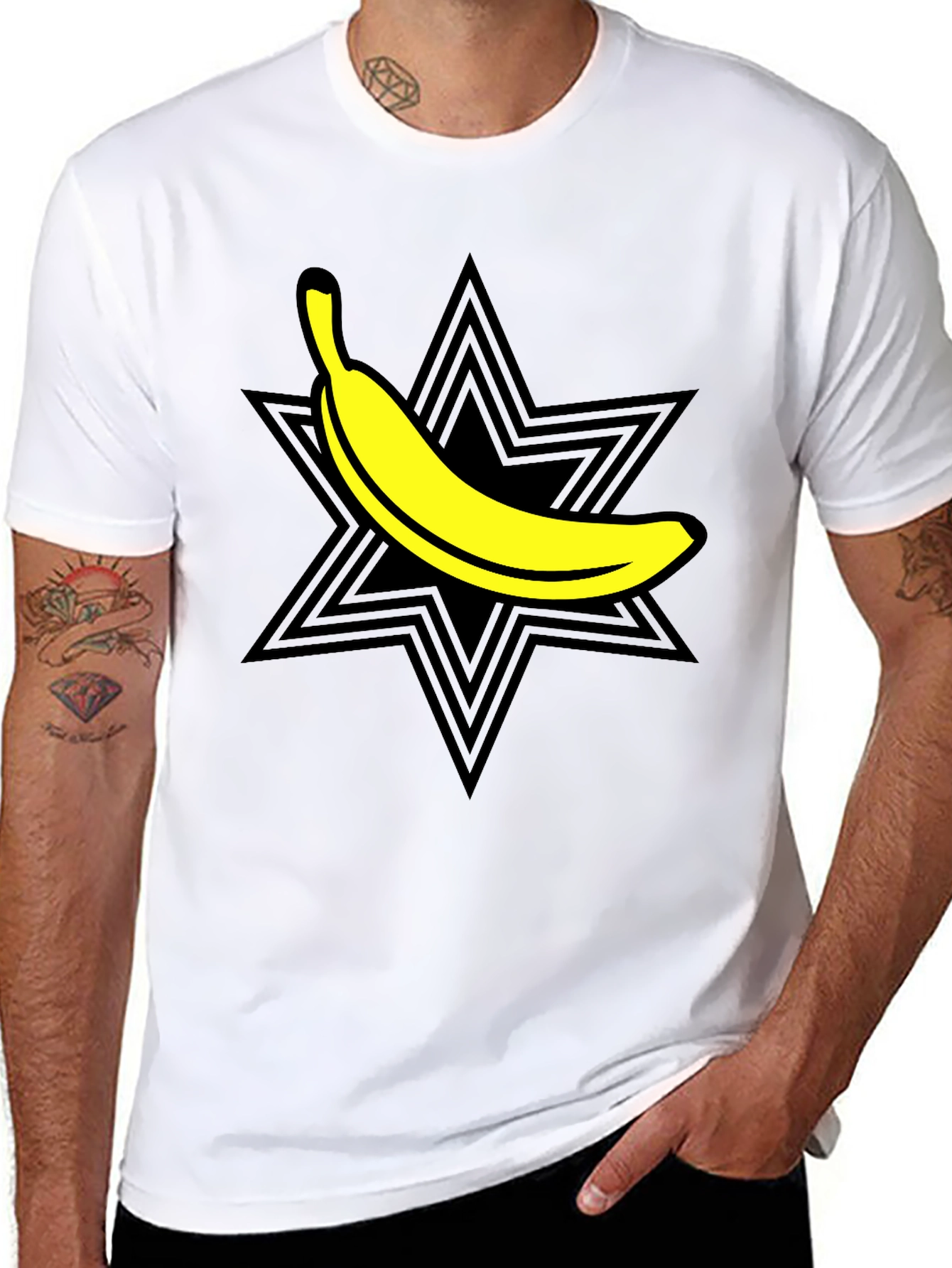 Luce un estilo audaz con esta camiseta negra de manga corta. El diseño presenta un plátano amarillo brillante sobre una estrella de seis puntas en tonos oscuros, creando un contraste llamativo y moderno. Perfecta para expresar tu individualidad y destacar entre la multitud. El tejido suave y cómodo la hace ideal para usar a diario, ya sea para salir con amigos o relajarte en casa. Añade un toque de originalidad a tu vestuario con esta prenda única y versátil.