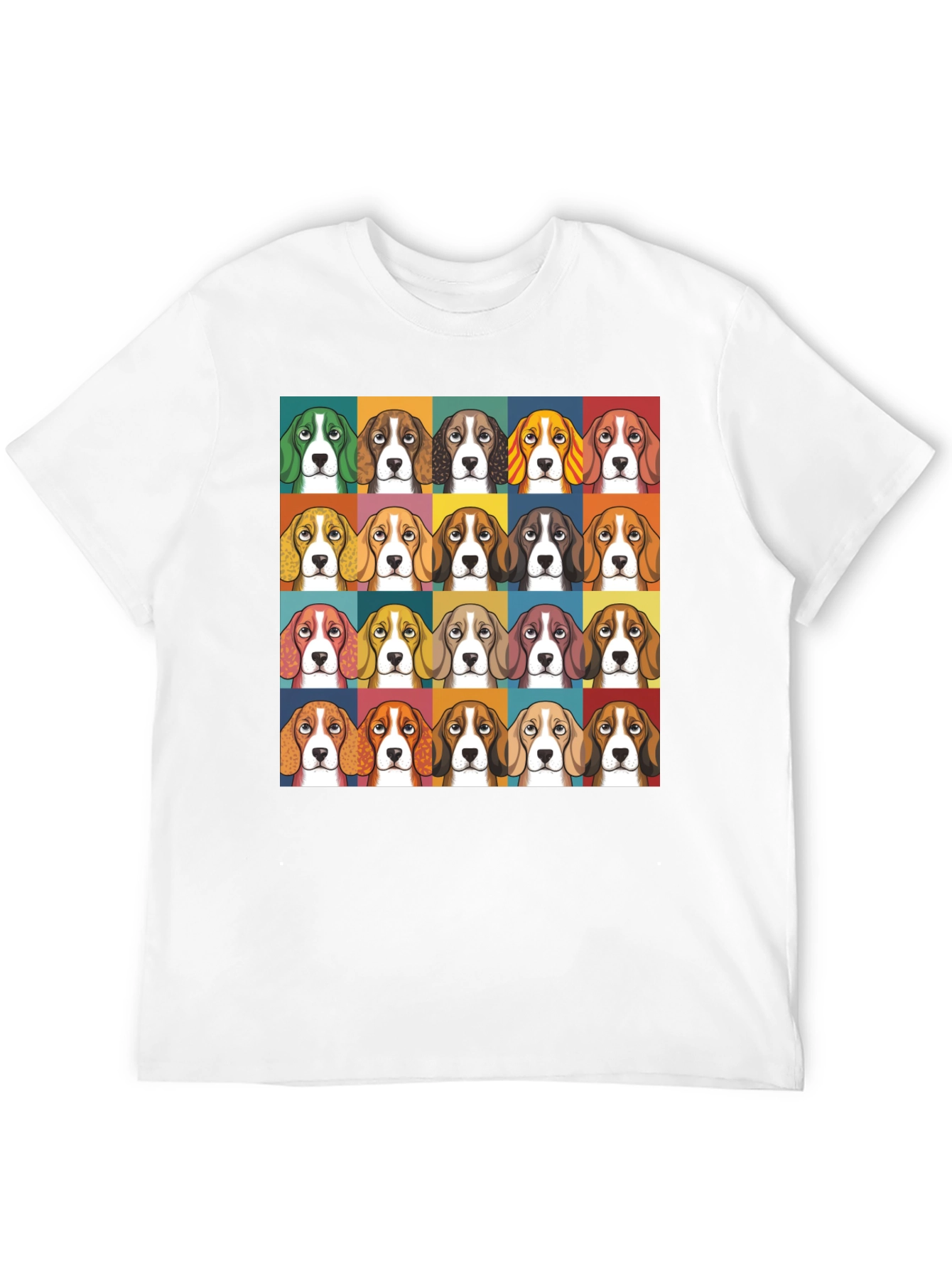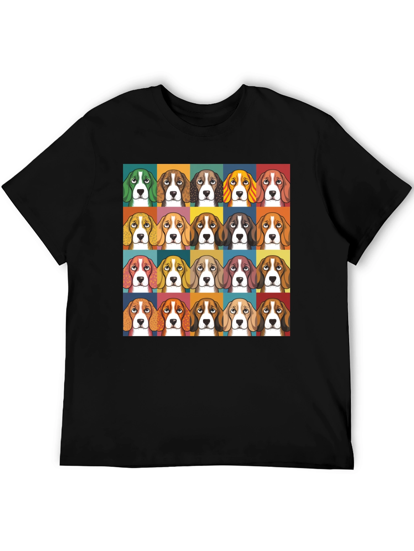 Esta camiseta negra presenta un estampado llamativo de múltiples caras de beagle en un estilo de diseño gráfico. Cada cara está enmarcada en cuadrados de diferentes colores, creando un patrón atractivo y moderno. Fabricada con un tejido suave y cómodo, esta camiseta de manga corta es perfecta para uso diario. Ideal para amantes de los perros y aquellos que buscan una prenda casual con un toque distintivo. Combina bien con jeans, pantalones cortos o faldas, adaptándose a diversos estilos. Añade un toque divertido y original a tu guardarropa con esta camiseta única.