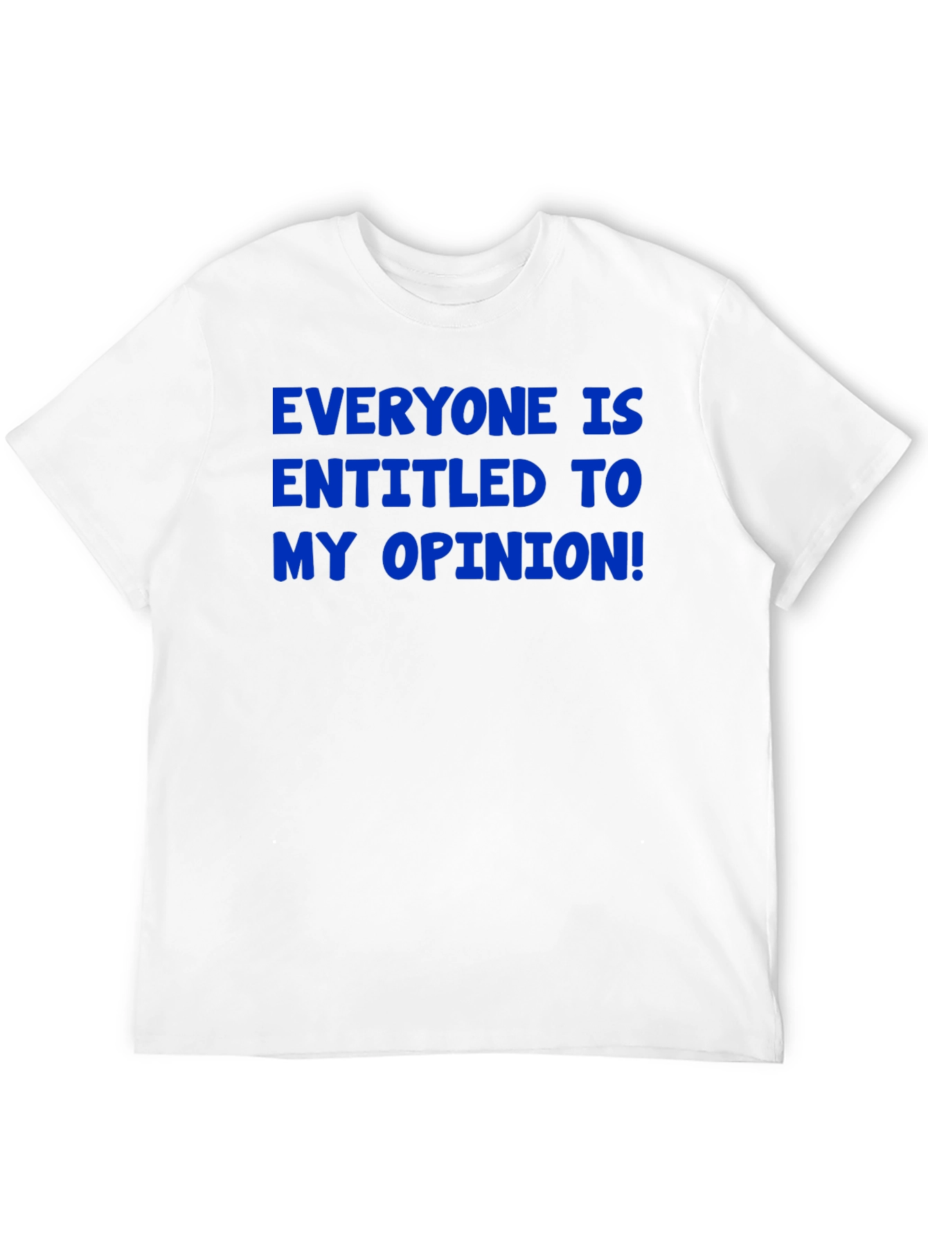 ¡Expresa tu sentido del humor con esta camiseta negra! Confeccionada en un material que parece ser de algodón suave, esta camiseta de corte clásico es perfecta para un look casual y cómodo. El diseño presenta una llamativa frase en color azul: "EVERYONE IS ENTITLED TO MY OPINION!", que seguro provocará sonrisas y conversaciones. Ideal para usar en reuniones informales con amigos, salidas de fin de semana o simplemente para relajarte en casa. Esta camiseta es una forma divertida de mostrar tu personalidad y agregar un toque de humor a tu vestuario diario. ¡Consigue la tuya y prepárate para recibir cumplidos y risas!