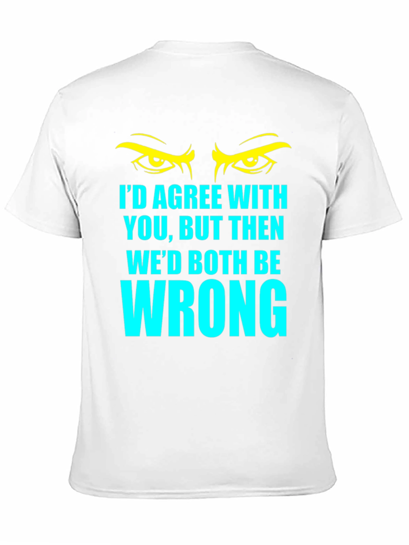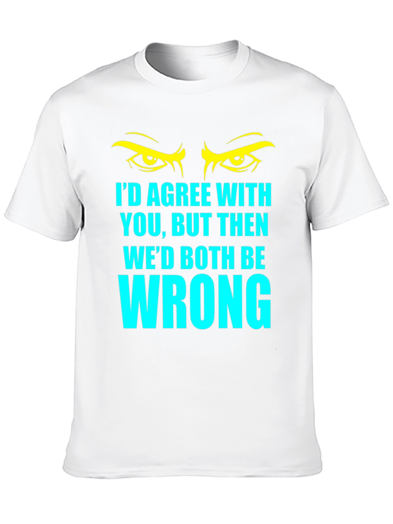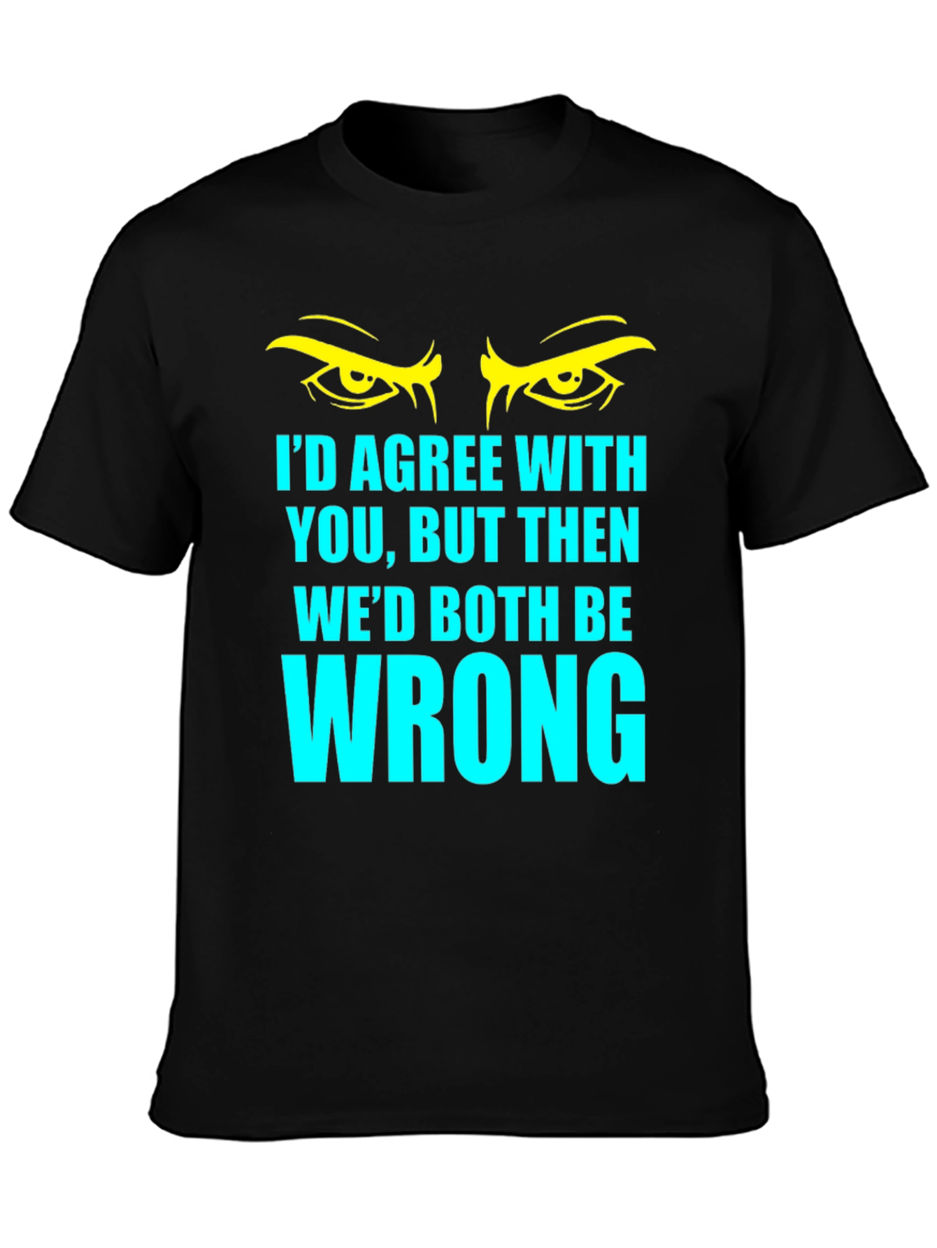 Esta camiseta negra de manga corta presenta un diseño llamativo con un par de ojos amarillos amenazantes en la parte superior. Debajo de los ojos, una frase en letras cian llamativas dice: "I'D AGREE WITH YOU, BUT THEN WE'D BOTH BE WRONG" (Estaría de acuerdo contigo, pero entonces ambos estaríamos equivocados). Es una prenda ideal para quienes disfrutan del humor sarcástico y desean expresar su individualidad con estilo. Perfecta para usar en reuniones informales con amigos o para añadir un toque de irreverencia a tu vestuario diario. Su diseño único la convierte en un tema de conversación garantizado. ¡Exprésate con esta camiseta de declaración audaz y deja que tu sentido del humor brille!