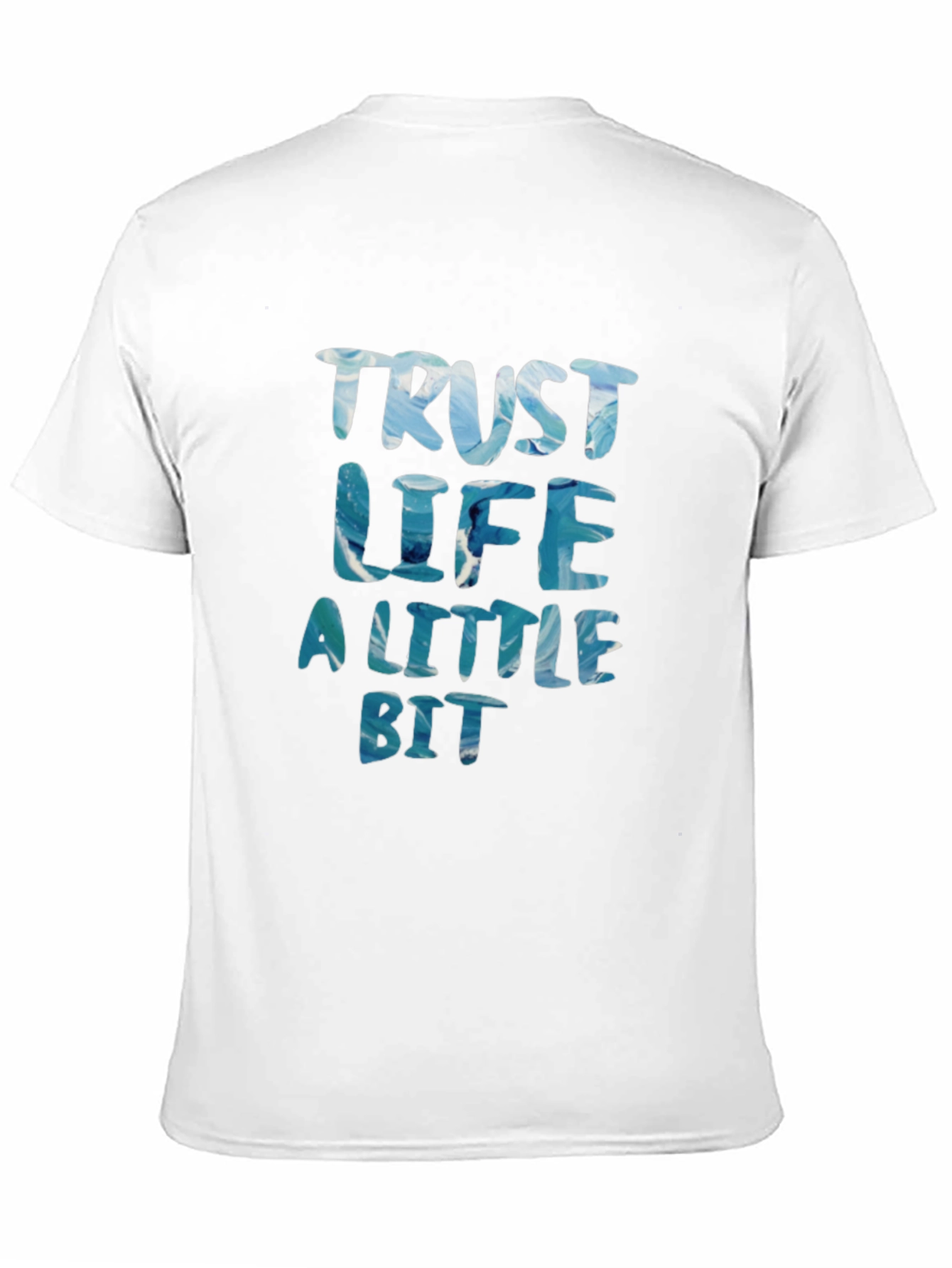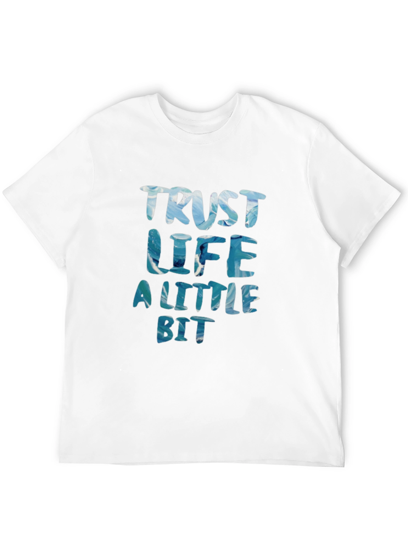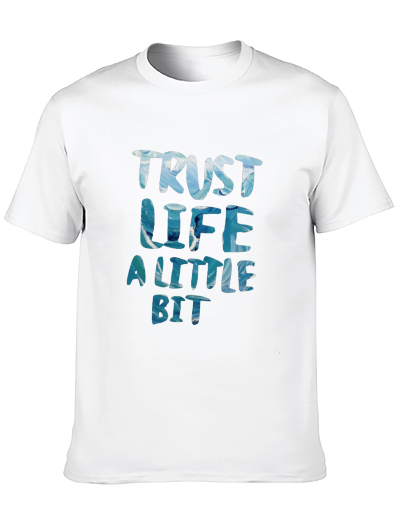 Luce esta moderna camiseta negra con un diseño único que invita a la reflexión. El texto "TRUST LIFE A LITTLE BIT" destaca en un llamativo degradado de azules que simula el movimiento del agua. Confeccionada en un material suave al tacto, esta camiseta ofrece comodidad y estilo en cada uso. Perfecta para un look casual y relajado, ideal para combinar con jeans o pantalones cortos. Su diseño original y mensaje inspirador la convierten en una prenda imprescindible en tu armario. ¡Atrévete a confiar un poco más en la vida con esta increíble camiseta!
