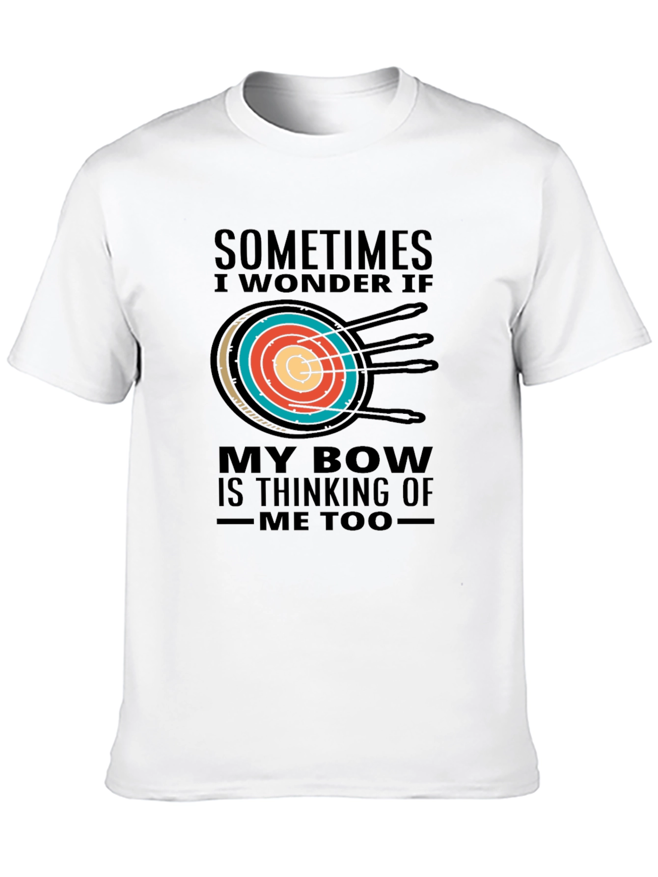 Esta camiseta negra presenta un diseño llamativo ideal para los amantes de la arquería. Muestra un blanco de tiro con flechas, acompañado de la frase 'Sometimes I wonder if my bow is thinking of me too'. Confeccionada en tela suave y cómoda, es perfecta para usar en el día a día o durante tus prácticas de tiro con arco. Su diseño único la convierte en una excelente opción para expresar tu pasión por este deporte. ¡Añade un toque de humor y estilo a tu guardarropa con esta original camiseta!