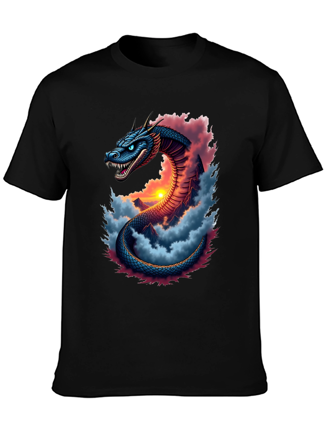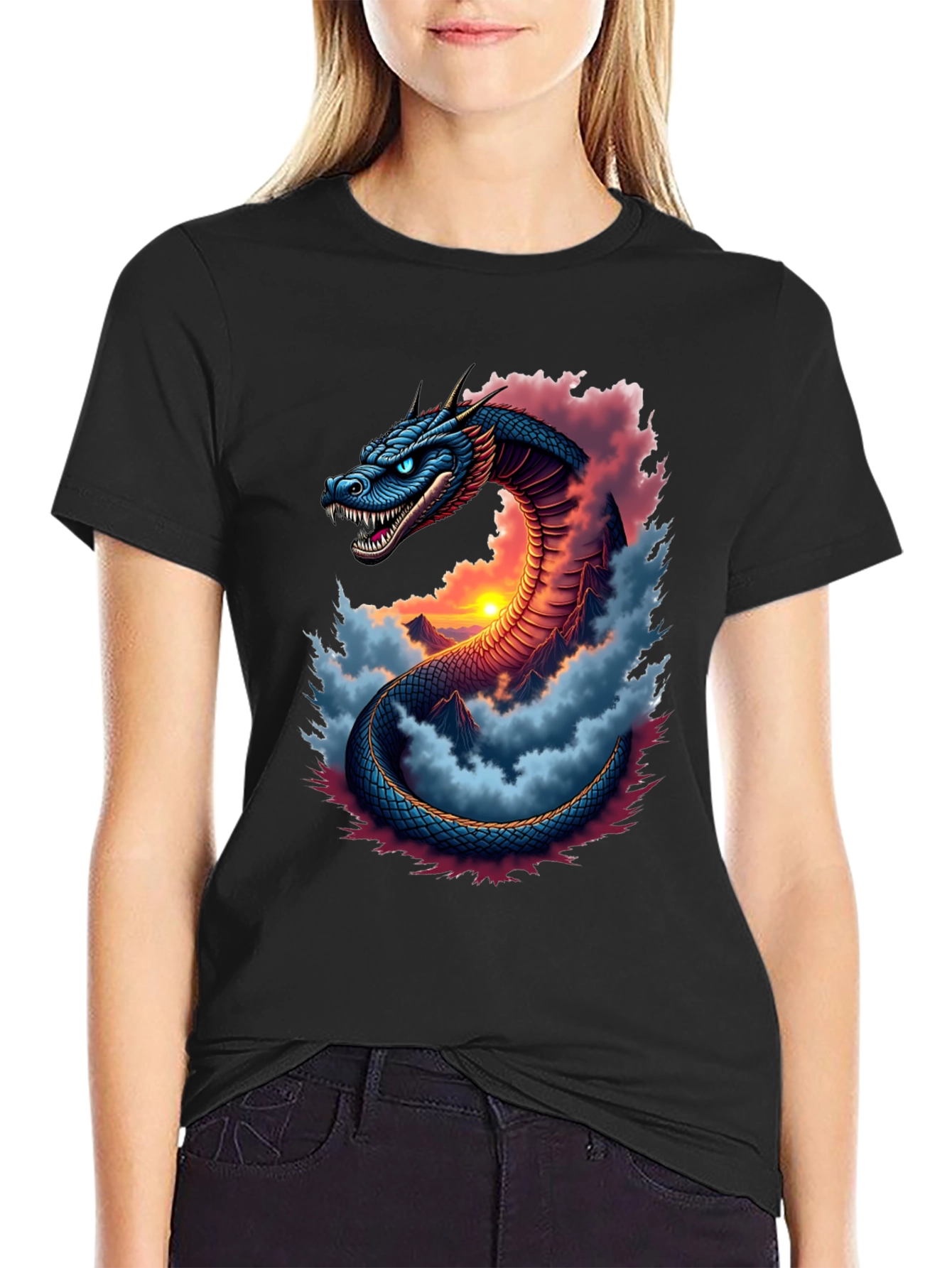 Luce esta llamativa camiseta negra con un impresionante diseño de un dragón serpiente. La criatura mística, con escamas azules y detalles naranja fuego, emerge de un fondo de nubes y montañas al atardecer, creando un efecto visual impactante. Esta camiseta de corte clásico, seguramente llamará la atención y añadirá un toque de fantasía y originalidad a tu vestuario. Perfecta para los amantes de la mitología, el arte fantástico y aquellos que buscan expresar su individualidad con estilo. ¡Ideal para uso diario, eventos casuales o como un regalo único!