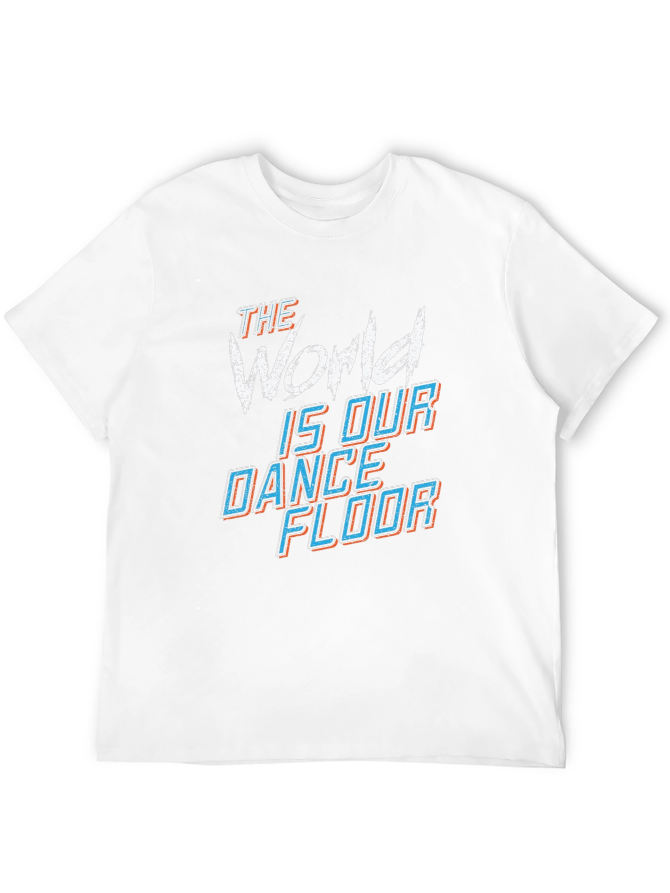 Esta camiseta negra de manga corta presenta un diseño audaz y llamativo. La frase "El Mundo Es Nuestra Pista de Baile" está impresa en letras llamativas, con un estilo retro en blanco, azul y naranja. Perfecta para los amantes del baile y la música que buscan expresar su pasión. Ideal para usar en conciertos, fiestas o simplemente para añadir un toque divertido y original a tu look diario. Fabricada con materiales cómodos y duraderos, esta camiseta es una declaración de estilo única y vibrante.