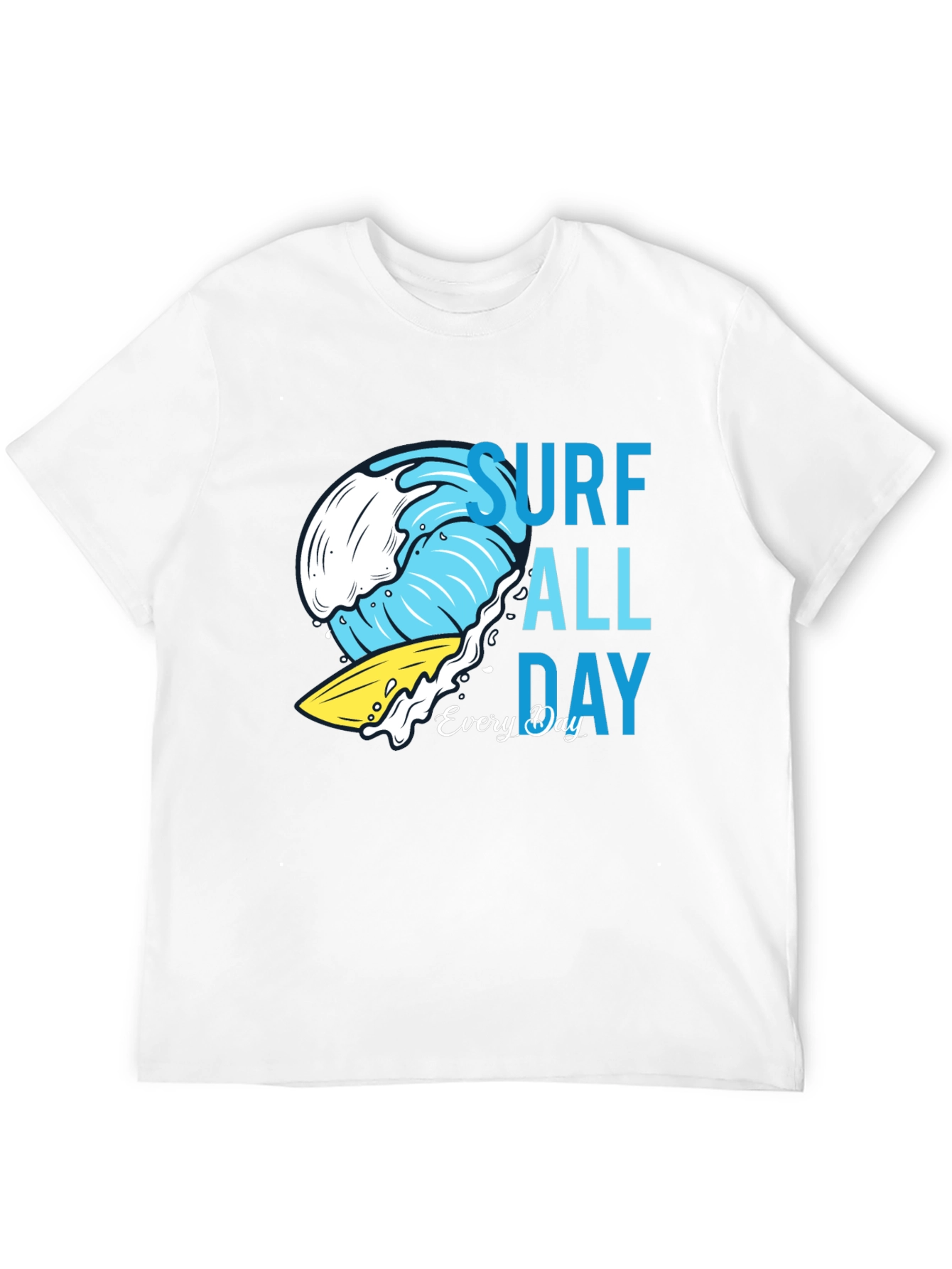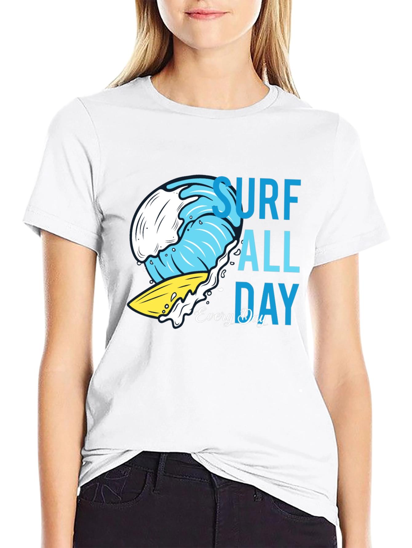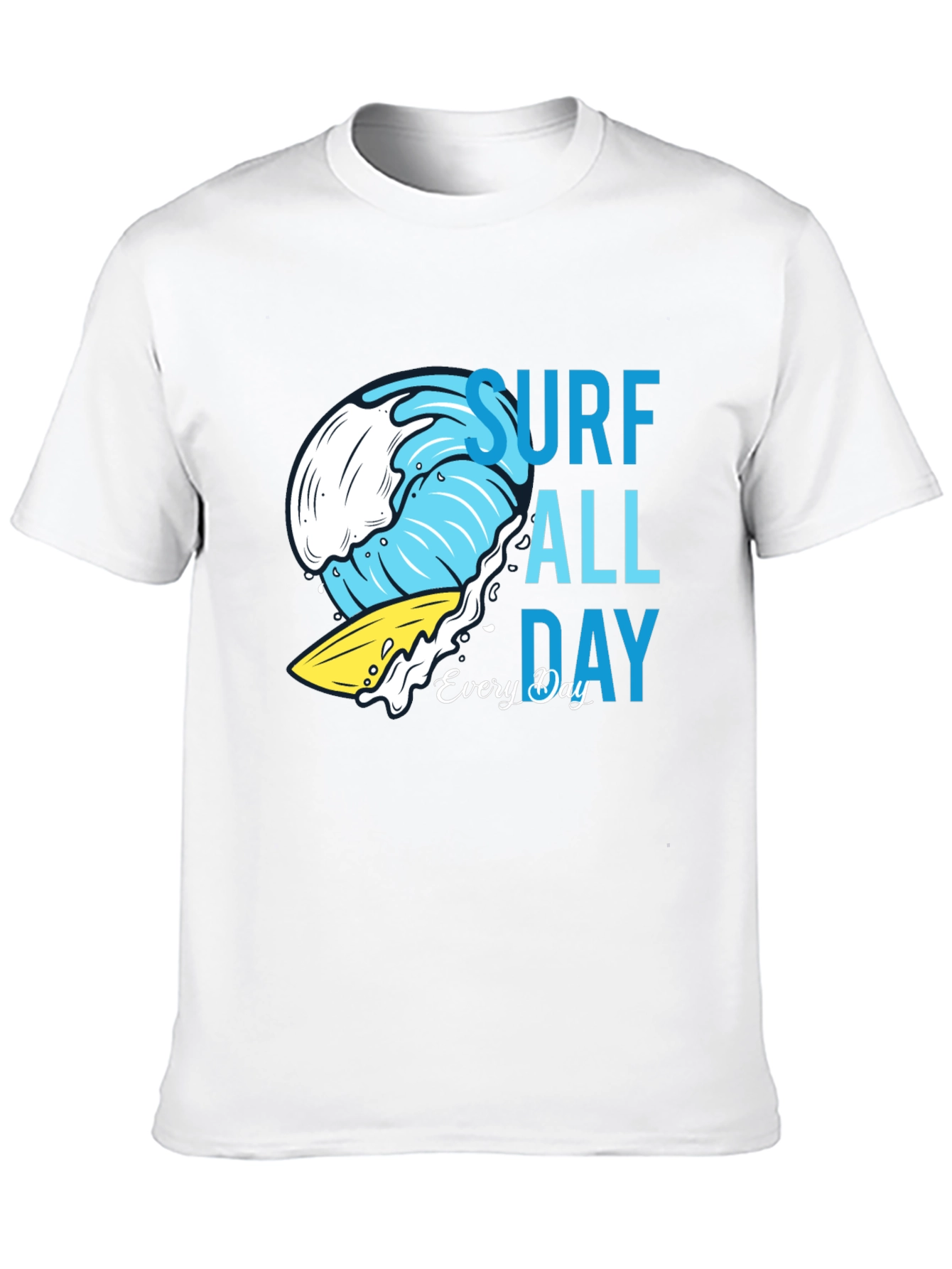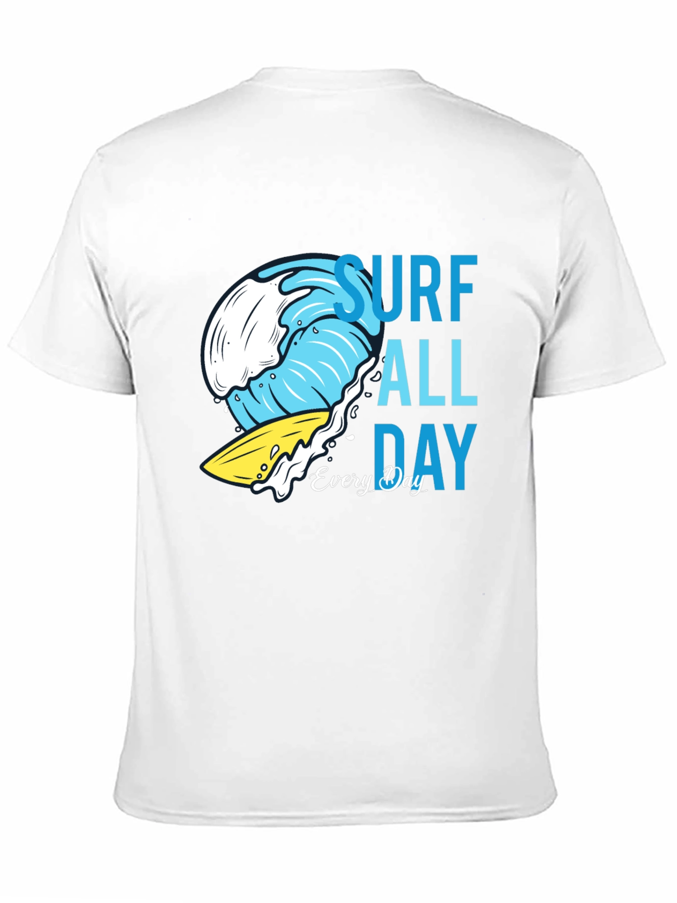 Disfruta del verano con esta camiseta negra de manga corta. Presenta un llamativo diseño con una ola, una tabla de surf amarilla y el texto "Surf All Day Every Day" en azul y blanco. Perfecta para los amantes del surf y el estilo casual. Su tejido suave y cómodo la hace ideal para usar a diario, ya sea en la playa, en la ciudad o relajándote en casa. Destaca tu pasión por el surf con esta prenda única y original. ¡Consigue la tuya y vive la emoción del surf todos los días!