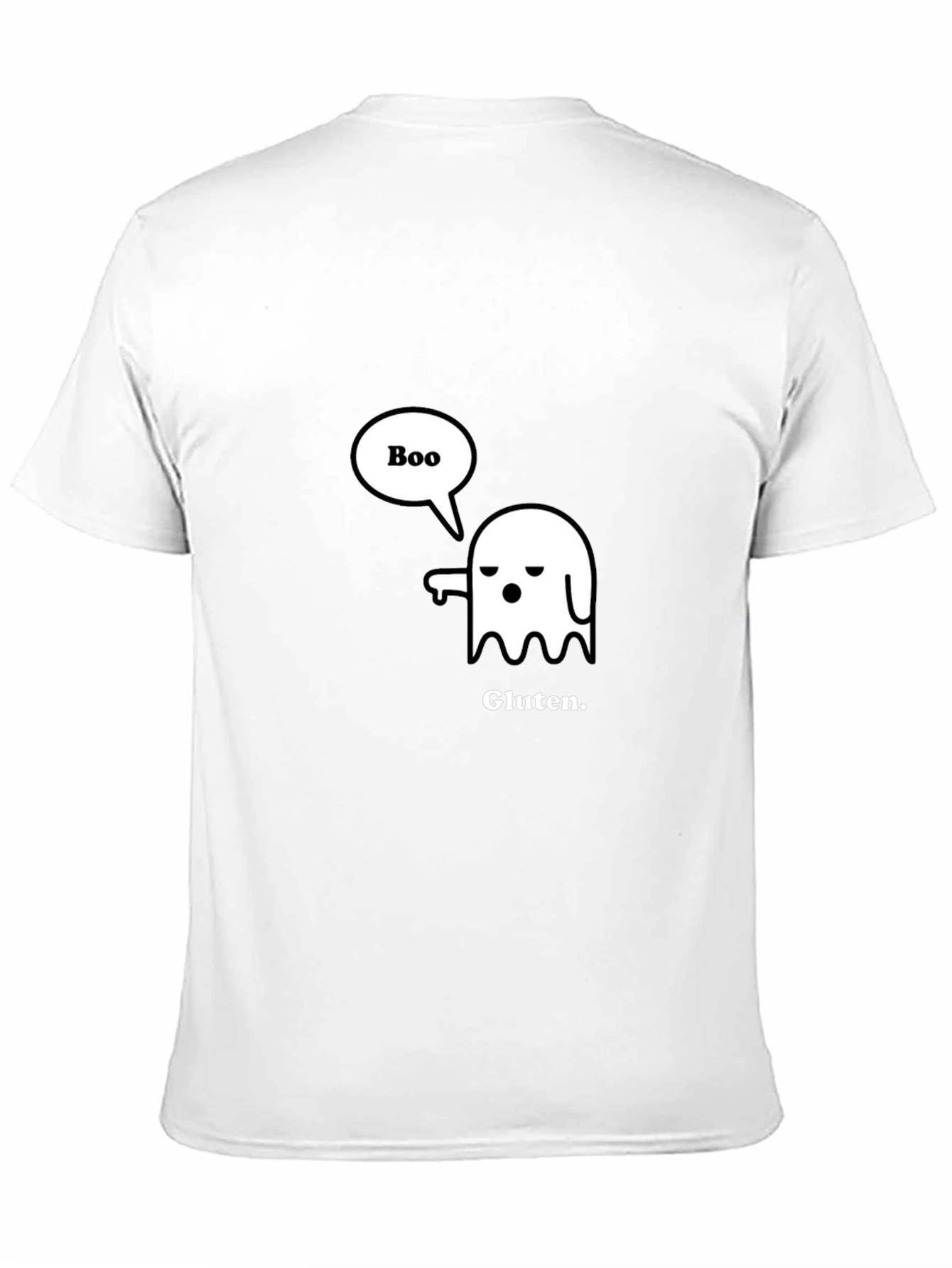 Esta camiseta negra de manga corta presenta un diseño divertido y original. En el centro, se observa un fantasma blanco con una expresión seria, señalando con el dedo y diciendo "Boo" en un bocadillo. Debajo del fantasma, la palabra "Gluten" refuerza el mensaje anti-gluten de manera humorística. Fabricada en un material suave y cómodo, esta camiseta es perfecta para expresar tu estilo personal y sentido del humor. Ideal para usar en cualquier ocasión casual, desde salidas con amigos hasta eventos temáticos. ¡Muestra tu actitud con esta camiseta única!