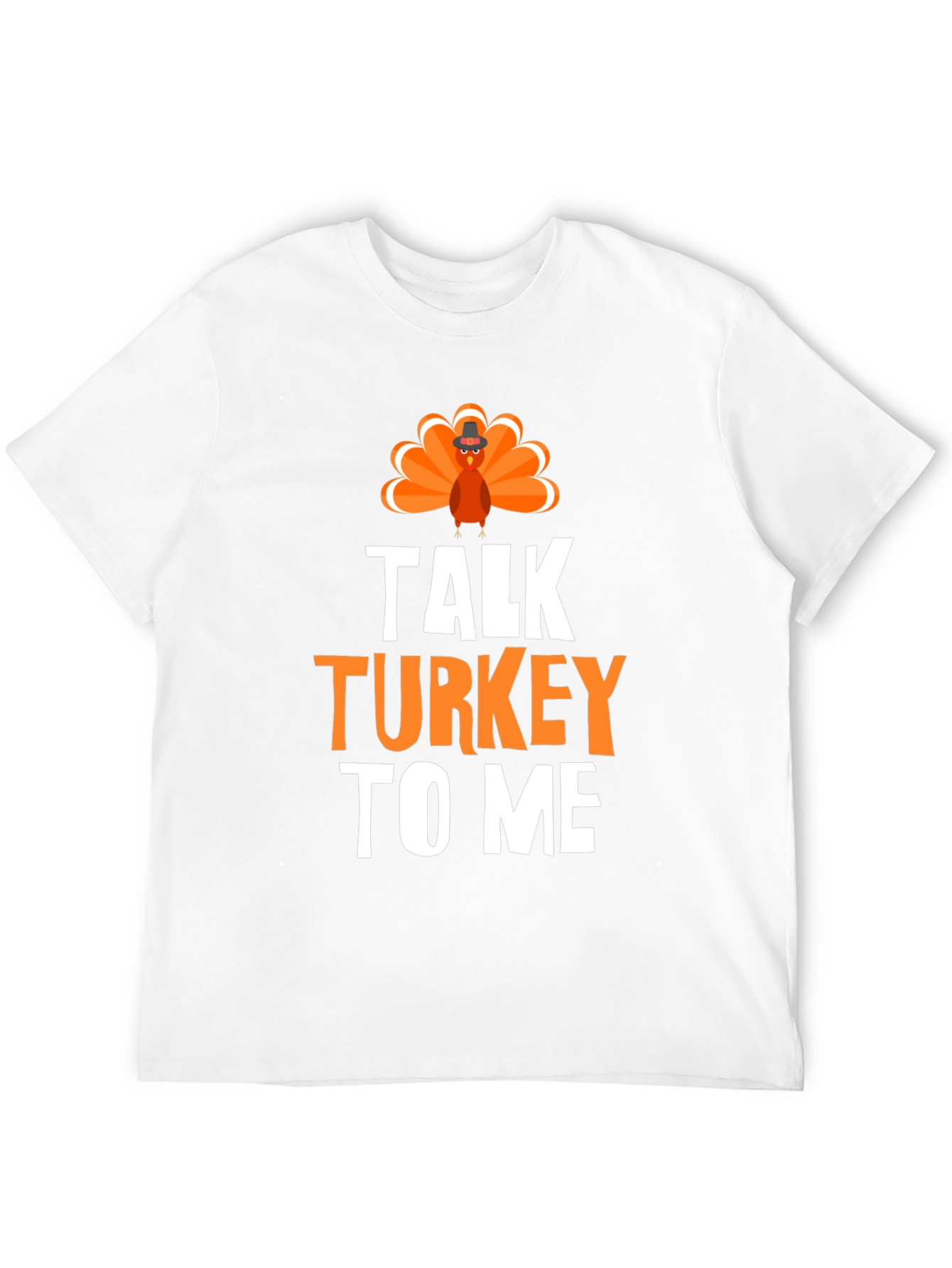 Luce esta divertida camiseta negra con un diseño alusivo al Día de Acción de Gracias. La camiseta presenta un simpático pavo animado con un sombrero de copa, sobre el texto "Talk Turkey To Me", donde "Turkey" (pavo) está resaltado en color naranja. El contraste del blanco y naranja sobre el fondo negro hace que el diseño resalte. Perfecta para llevar en celebraciones familiares o para cualquier amante de esta festividad. Fabricada con materiales suaves y cómodos, es ideal para un look casual y festivo. ¡Prepárate para las risas y los buenos momentos con esta original prenda!