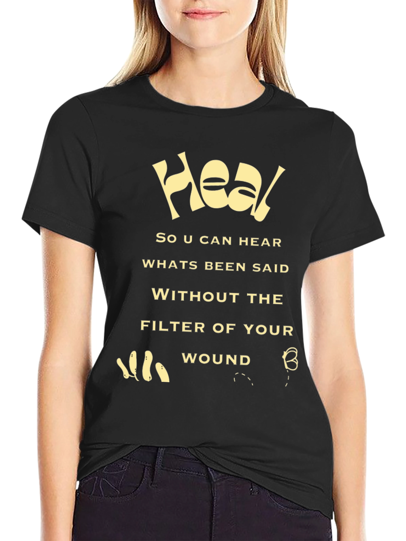 Descubre la camiseta negra con un poderoso mensaje: "Heal so u can hear whats been said without the filter of your wound". Esta prenda única no solo ofrece comodidad y estilo, sino que también promueve la reflexión interna. Su diseño en letras doradas destaca sobre el fondo negro, creando un contraste llamativo y elegante. Fabricada con materiales suaves al tacto, esta camiseta es ideal para el uso diario o para eventos casuales donde quieras expresar tu individualidad. Llévala para inspirar conversaciones significativas y recordar la importancia de la sanación personal. Perfecta para aquellos que buscan ropa con un mensaje profundo y un estilo inigualable.