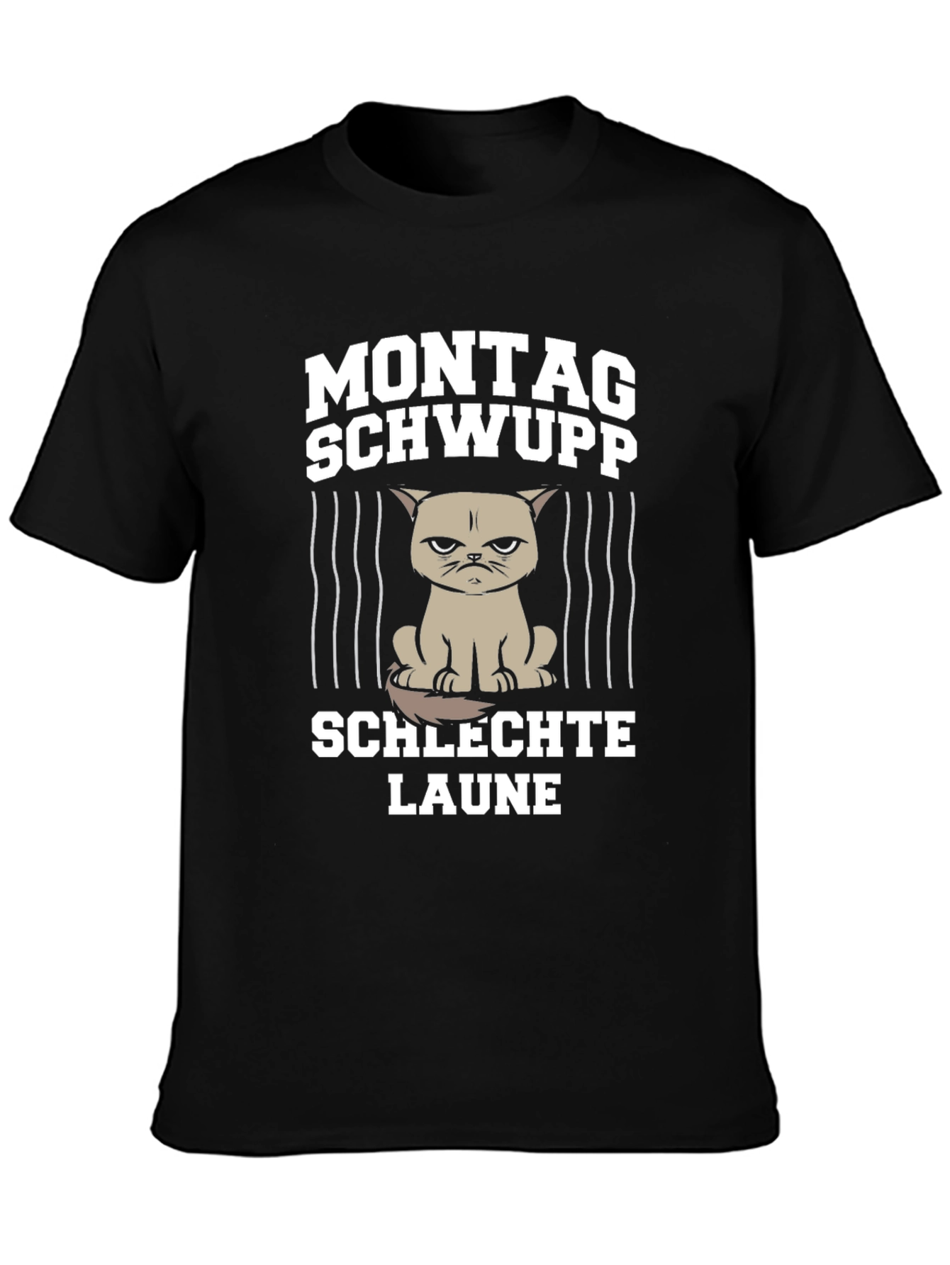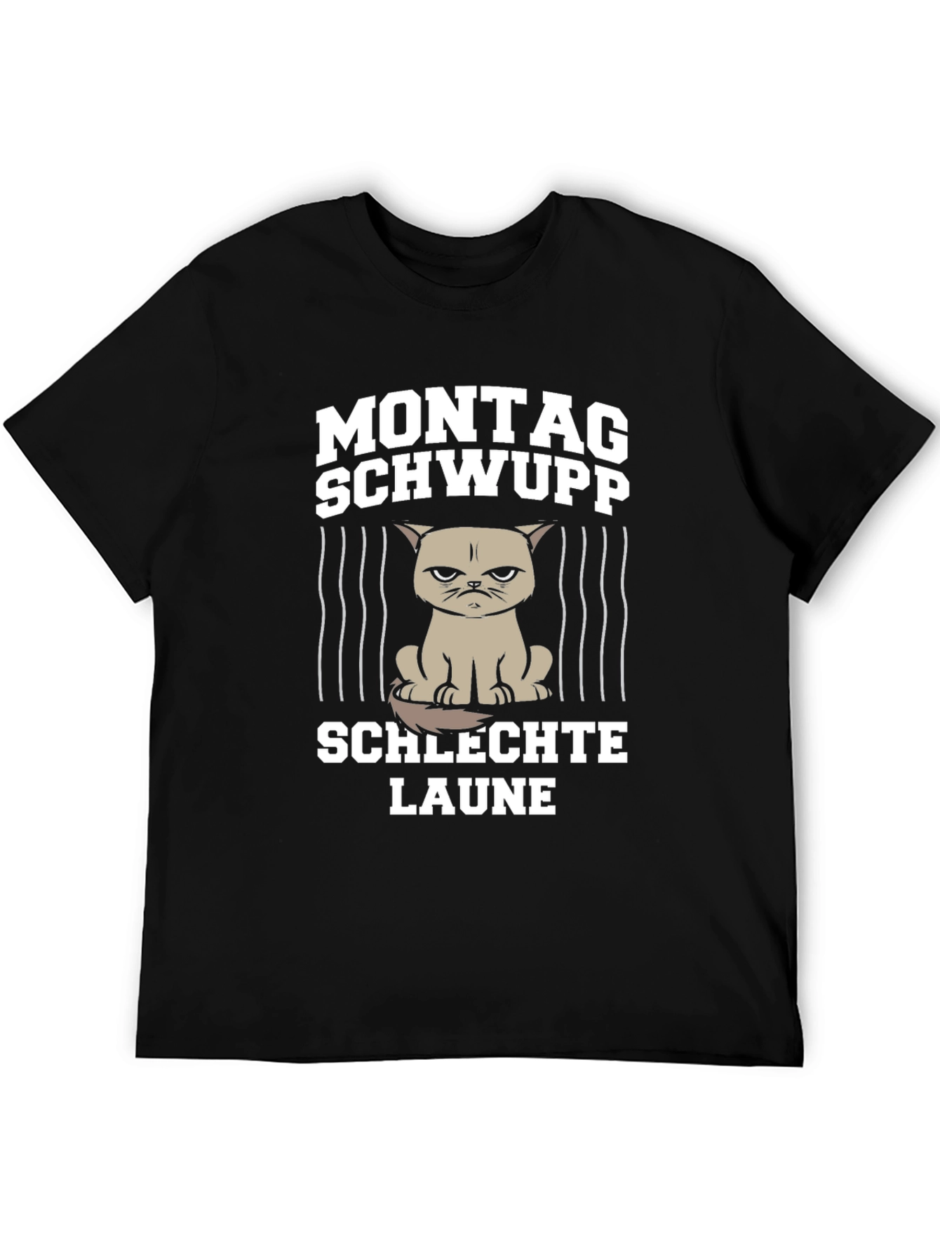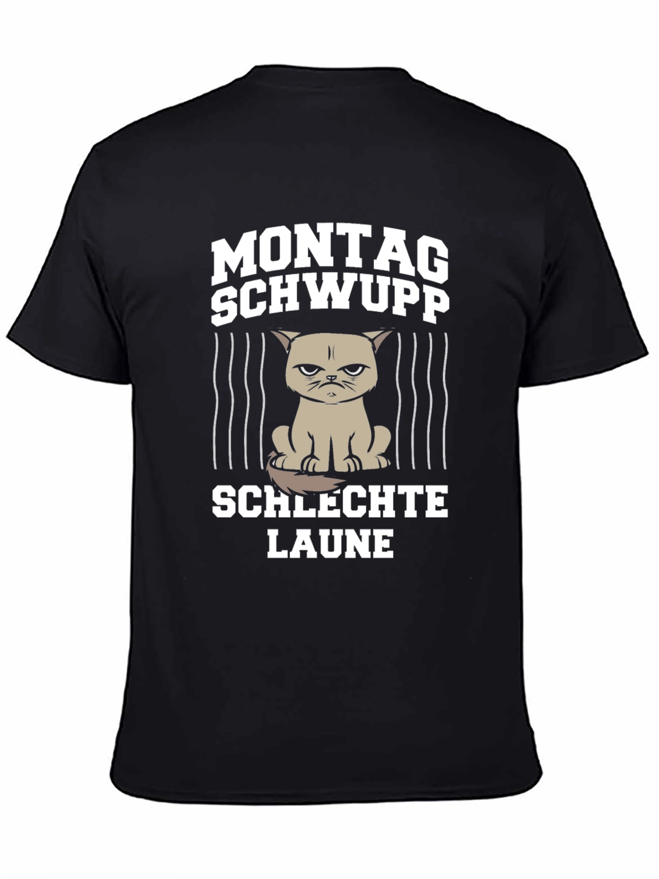 Luce una camiseta con un toque de humor y originalidad. Esta camiseta negra presenta un diseño llamativo con la frase "Montag Schwupp Schlechte Laune", acompañada de un gato con expresión gruñona tras unas líneas verticales, ideal para esos lunes difíciles. Fabricada con tela de alta calidad, esta camiseta ofrece comodidad y durabilidad. Perfecta para uso diario, salidas casuales o como un regalo divertido para amigos y familiares con un sentido del humor sarcástico. Añade un toque distintivo a tu vestuario con esta prenda única que seguramente llamará la atención.