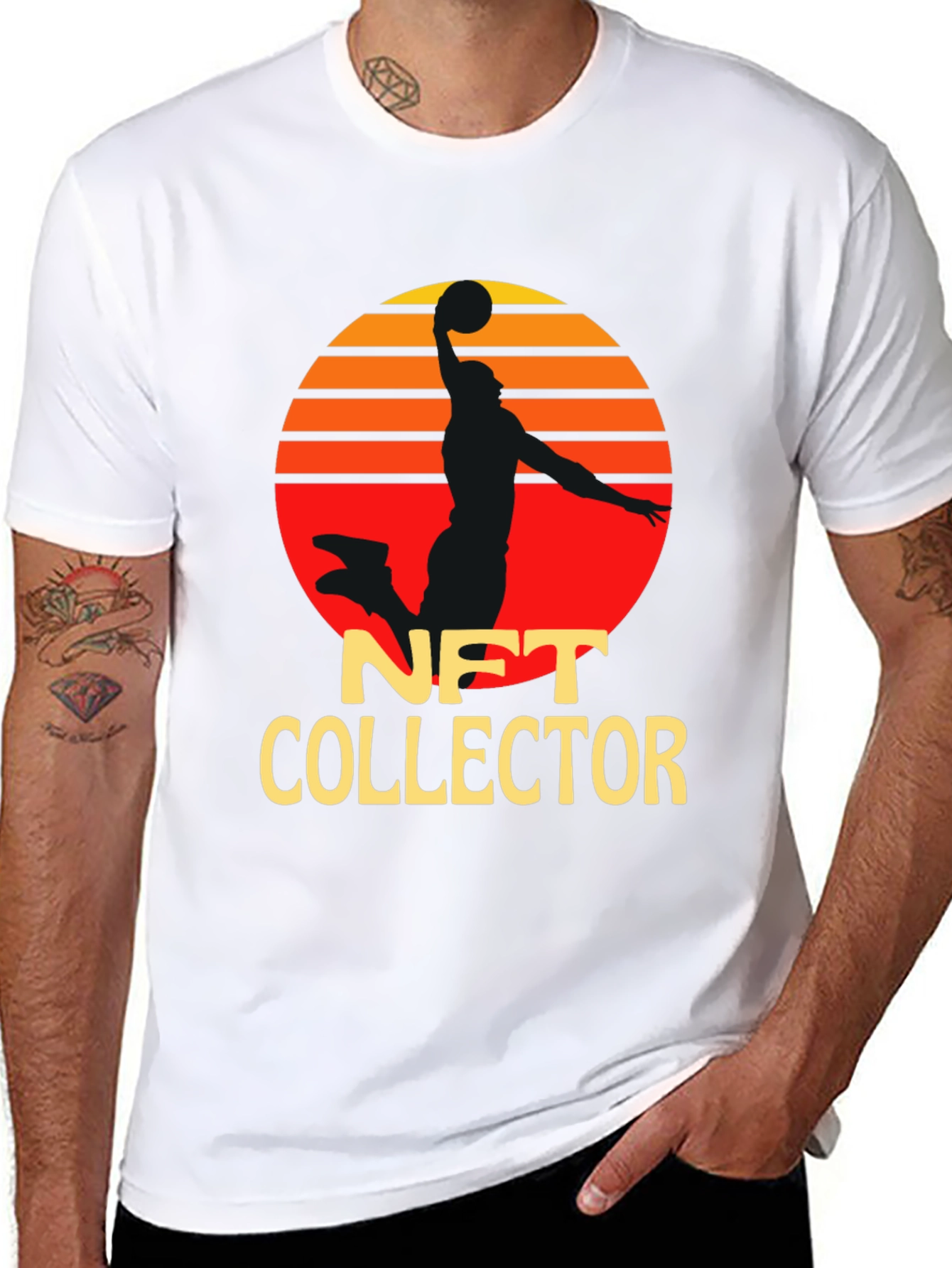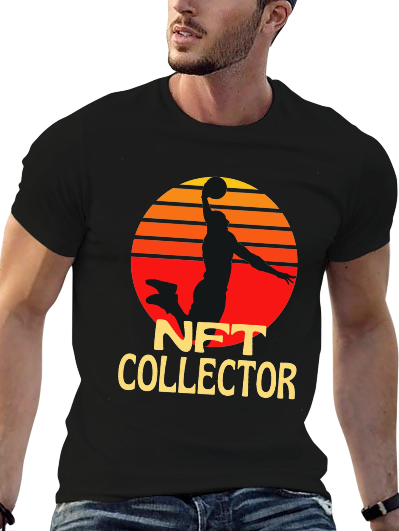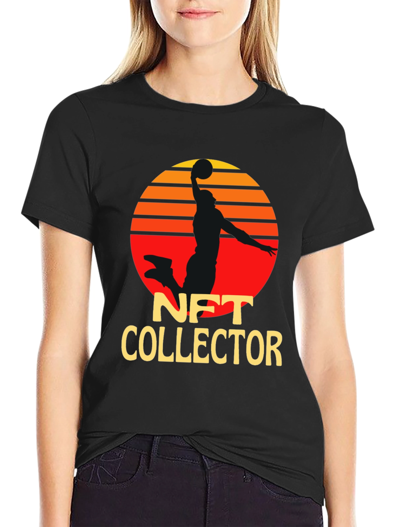 Luce esta llamativa camiseta negra con un diseño único. Presenta una silueta de un jugador de baloncesto encestando frente a un atardecer retro en tonos naranja y amarillo. Debajo, la inscripción "NFT COLLECTOR" resalta en un color dorado brillante. Esta camiseta de corte clásico, confeccionada en un material suave y cómodo, es perfecta para los amantes del baloncesto y el mundo de los NFTs. Ideal para usar en eventos deportivos, reuniones informales o simplemente para expresar tu pasión por la cultura digital. Un diseño original que no pasará desapercibido y te hará destacar.