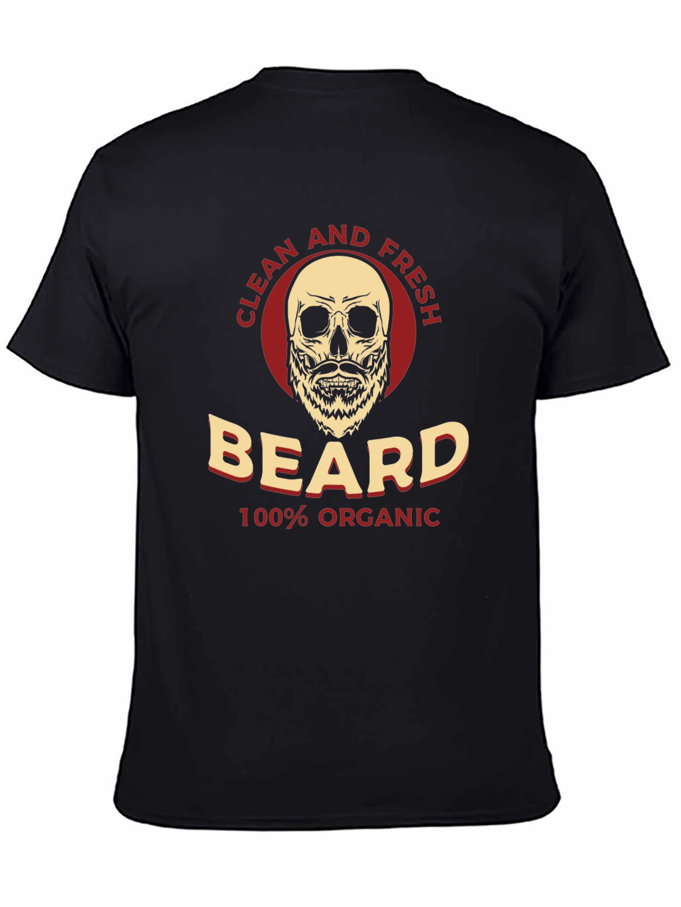 Esta camiseta negra presenta un diseño llamativo y original. Confeccionada con materiales que parecen ser orgánicos, presenta la frase "Beard Clean and Fresh" con un cráneo barbudo como protagonista. El diseño sugiere un producto relacionado con el cuidado de la barba o un guiño humorístico a los amantes de las barbas. Perfecta para un look casual con un toque irreverente, esta camiseta es ideal para destacar en el día a día. Su estilo único la convierte en una excelente opción para quienes buscan prendas con personalidad y conciencia ecológica. ¡Atrévete a lucir esta camiseta y muestra tu estilo con orgullo!