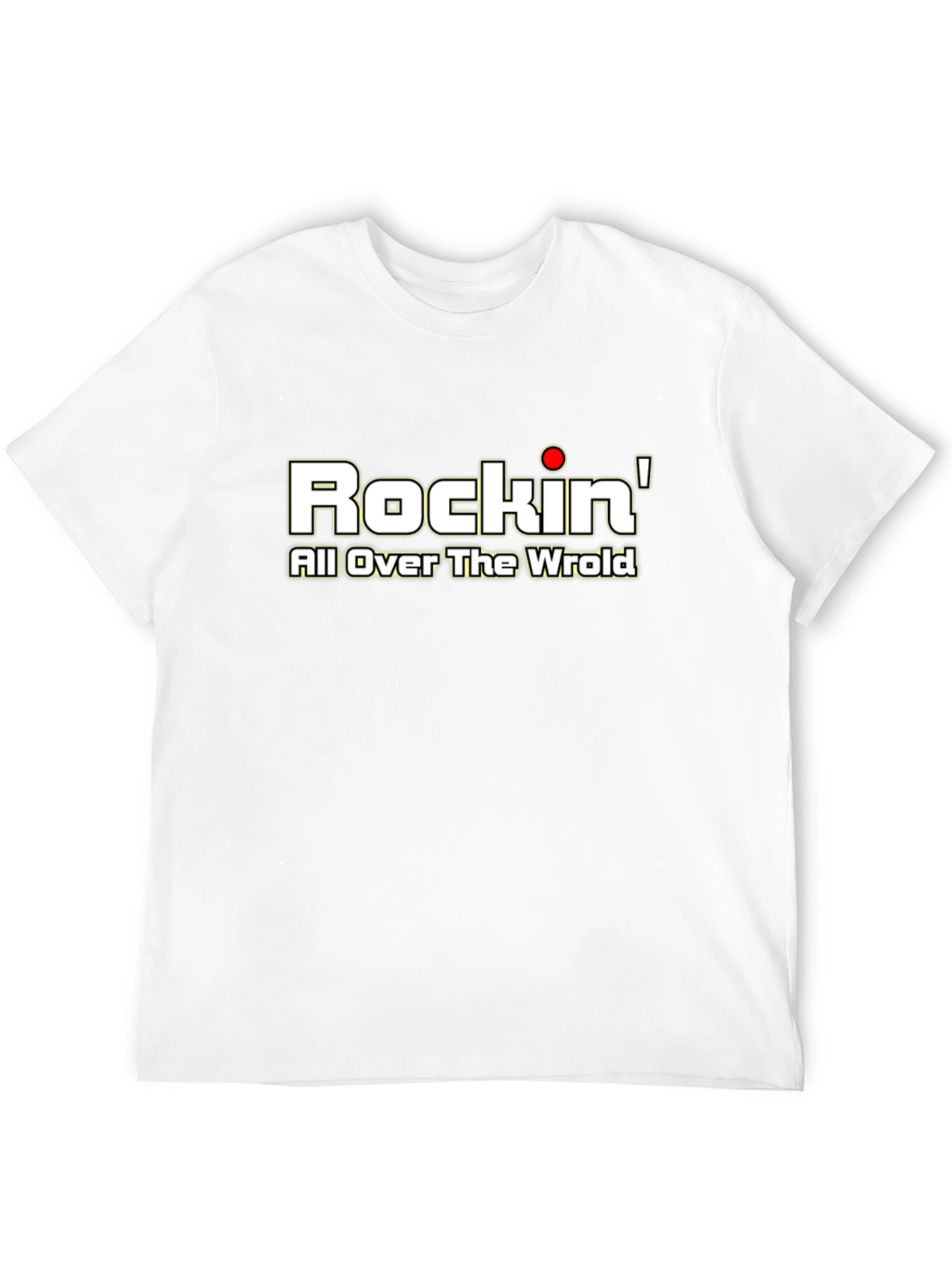 Luce un estilo rockero con esta camiseta negra de manga corta. Presenta un diseño llamativo con la inscripción "Rockin'" en letras blancas con un punto rojo distintivo, complementado por "All Over The Wrold" en un tipo de letra similar. Ideal para fanáticos de la música y aquellos que buscan expresar su personalidad con un toque audaz. Perfecta para usar en conciertos, salidas casuales o simplemente para destacar entre la multitud. Confeccionada con materiales cómodos y duraderos, esta camiseta te brindará estilo y confort en cada uso.