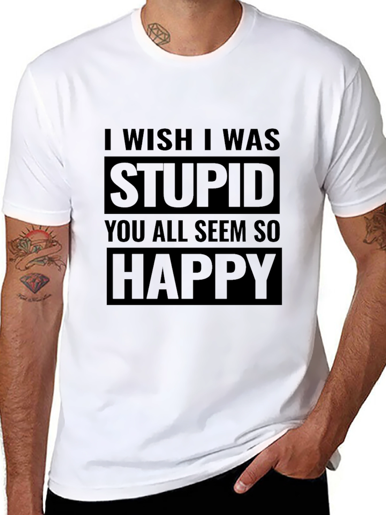 Esta camiseta negra de manga corta presenta un diseño audaz y llamativo. La frase "I wish I was STUPID. YOU ALL SEEM SO HAPPY" está estampada en letras grandes y llamativas en el centro de la camiseta. Hecha de un material suave y cómodo, ideal para uso diario. Perfecta para expresar tu sentido del humor único y destacar entre la multitud. Su estilo casual y moderno la hace versátil para combinar con jeans, pantalones cortos o faldas. ¡Añade un toque de ironía a tu guardarropa con esta camiseta!
