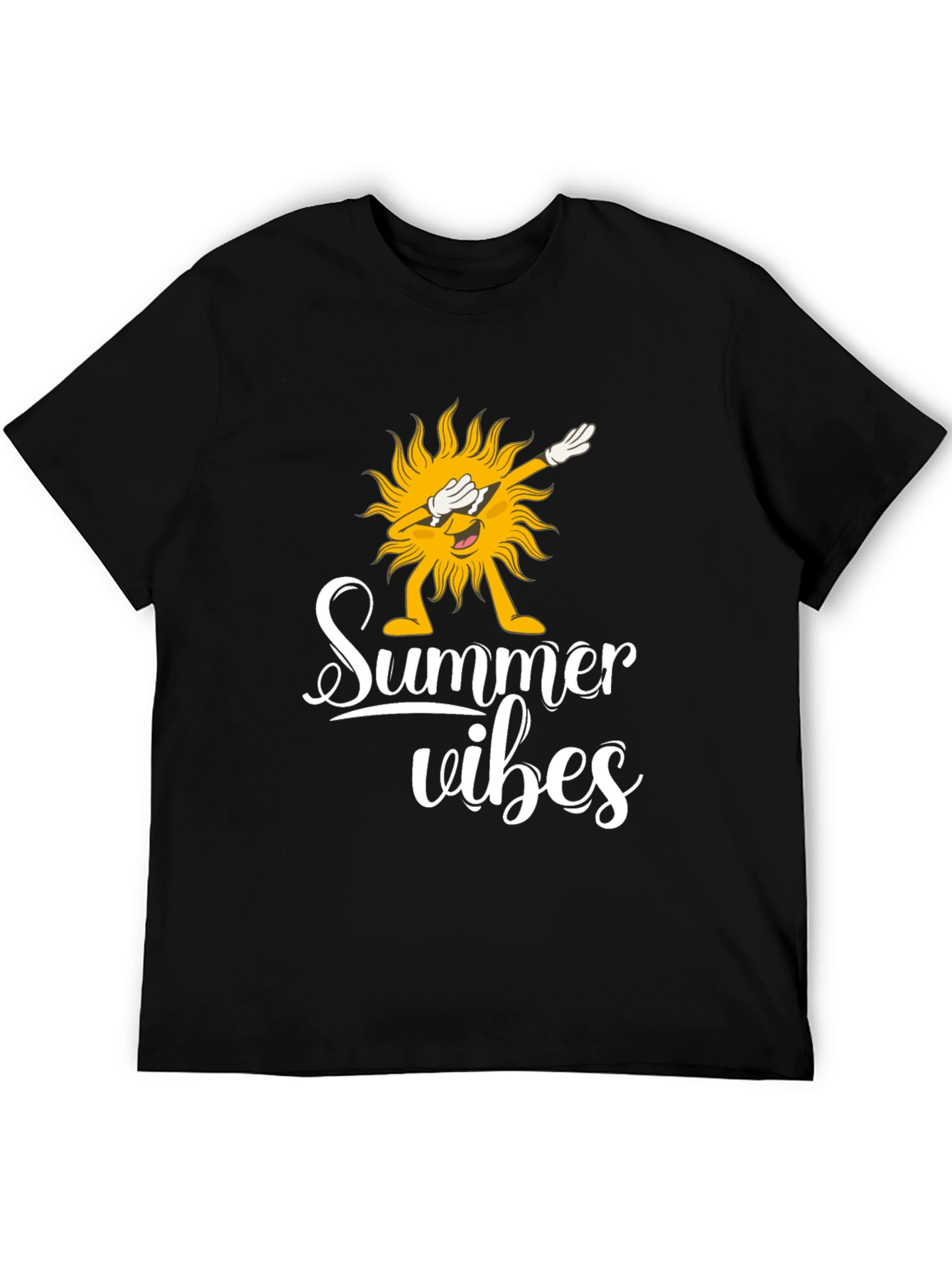Luce un estilo veraniego con esta camiseta negra de manga corta. Presenta un divertido diseño de un sol haciendo el famoso paso de baile 'dab', acompañado del texto "Summer vibes" en una tipografía moderna y elegante. Perfecta para los días cálidos, festivales o simplemente para añadir un toque alegre a tu vestuario diario. Su tejido suave y cómodo te permitirá moverte con libertad. Ideal para combinar con vaqueros, pantalones cortos o faldas. ¡Prepárate para irradiar buena vibra este verano!