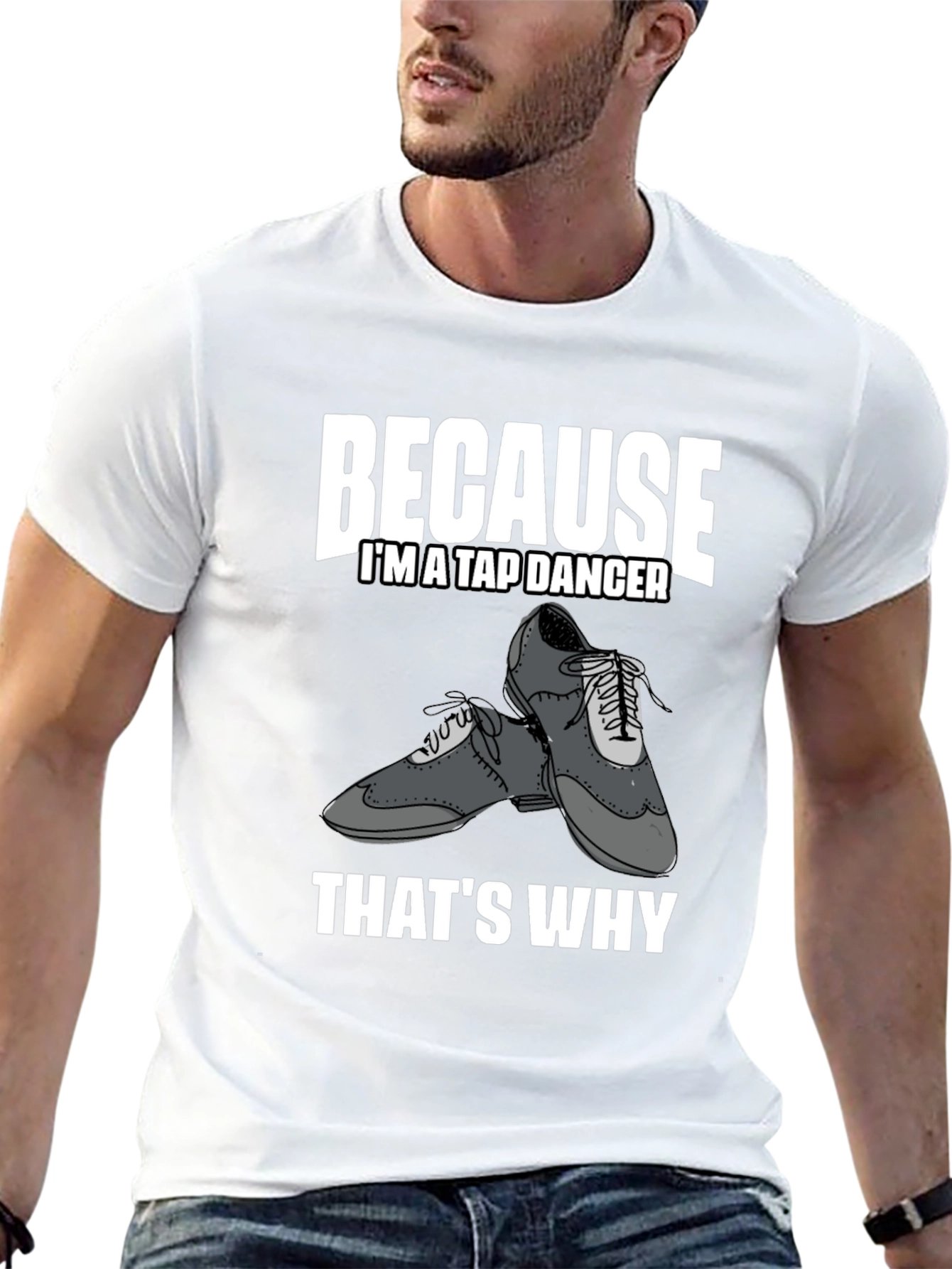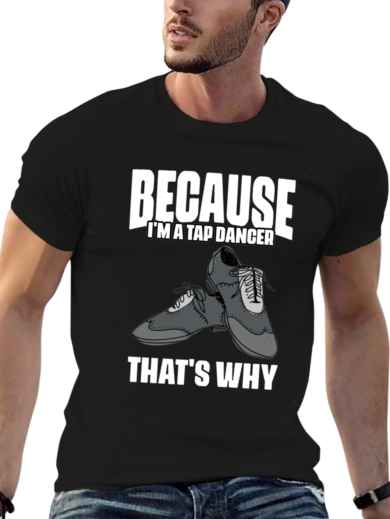 Esta camiseta negra presenta un diseño llamativo ideal para los amantes del tap. Confeccionada en un tejido suave y cómodo, la camiseta muestra la frase "BECAUSE I'M A TAP DANCER THAT'S WHY" en letras blancas audaces, acompañada de una ilustración de zapatos de tap. El diseño simple pero impactante la convierte en una prenda versátil para usar en clases de baile, eventos temáticos o simplemente para mostrar tu pasión por el tap. Su corte clásico asegura un ajuste favorecedor. Perfecta para bailarines y aficionados por igual, esta camiseta te permite expresar tu amor por el tap con estilo y comodidad.