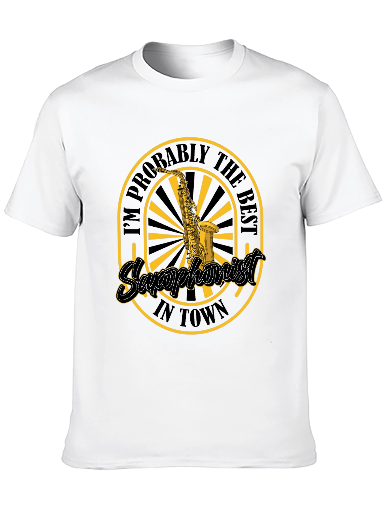 Luce tu pasión por la música con esta original camiseta negra. Presenta un diseño llamativo con un saxofón dorado en el centro, rodeado por la frase 'I'm probably the best Saxophonist in town' ('Probablemente soy el mejor saxofonista de la ciudad'). Ideal para músicos, amantes del jazz, y cualquier persona con un sentido del humor musical. Su diseño gráfico único y su corte clásico la hacen perfecta para usar en conciertos, ensayos, o simplemente para mostrar tu estilo personal. Fabricada con materiales cómodos y duraderos, esta camiseta te permitirá expresar tu amor por el saxofón con estilo y confianza.
