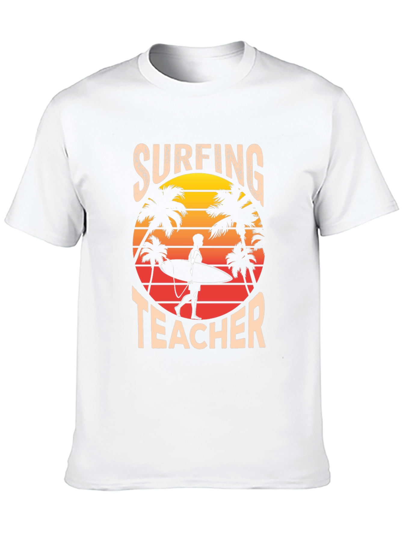 Luce esta camiseta negra con un diseño vibrante que captura la esencia del surf. Un atardecer naranja y amarillo sirve de fondo para una silueta de un surfista caminando entre palmeras, con las palabras "SURFING TEACHER" resaltando el estilo relajado y profesional. Perfecta para profesores de surf, amantes del mar o para aquellos que disfrutan de un estilo de vida playero. Ideal para usar en la playa, clases de surf o simplemente para expresar tu pasión por este deporte. Su diseño único y llamativo te hará destacar.